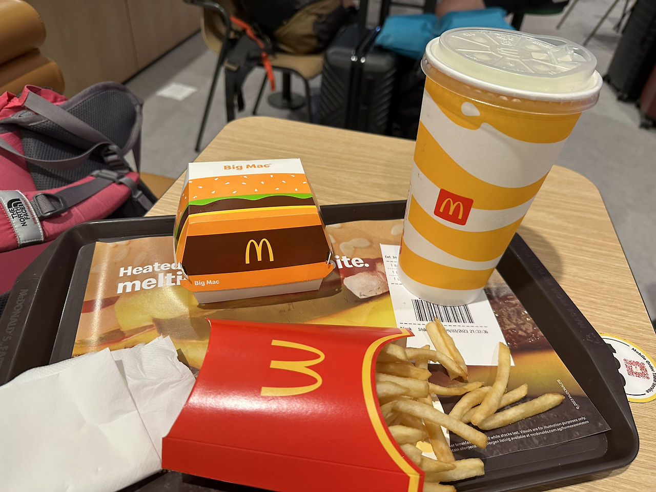 빅맥 라지세트를 먹었다. 빅맥지수를 알아보기 위한 것은 아니고, 가장 만만한 메뉴랄까. 먹을 식당 선택, 메뉴 선택이 어려울 땐 대표식당 대표메뉴를 먹는 편이다.이고 다니는 짐이 많아서 빠른 결정이 필요했다. 빅맥이 생각보다 작아서 이름을 스몰맥으로 바꿔야 할 것 같다고 혼자 생각했다. 먹다 보니 배부르긴 하더라.
