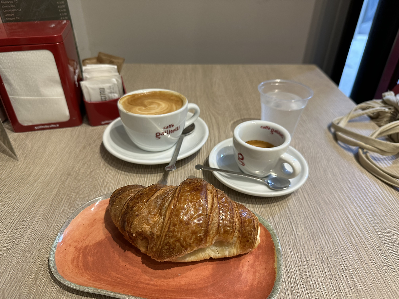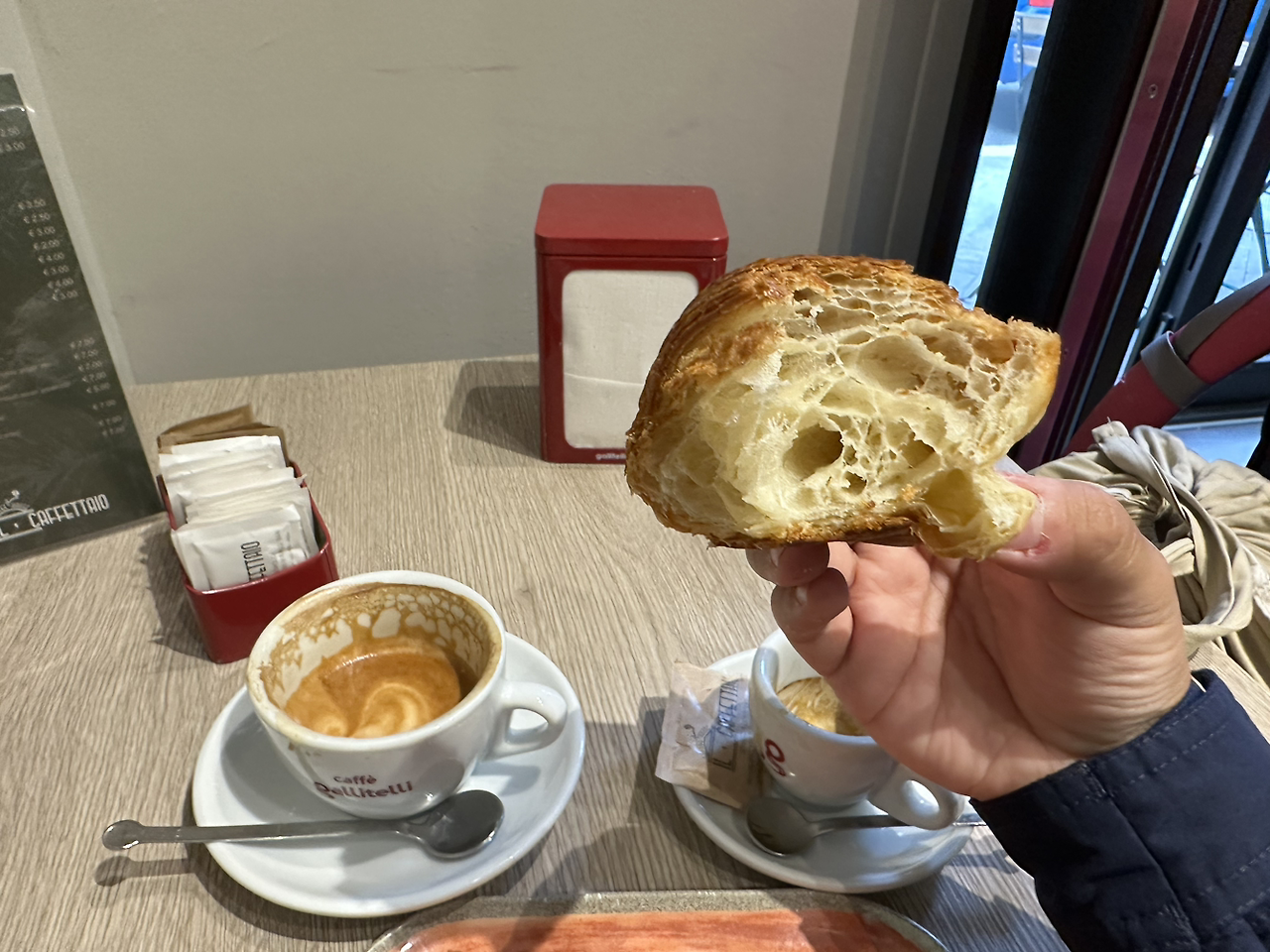 10분쯤 걸어 나오면, 현대적인 거리가 펼쳐진다. 유명 브랜드들이 즐비하다. 과거와 현재가 공존하는데, 모두 걸어서 다닐 수 있어서 편안하다. 카페에 들어가 에스프레소 한 잔, 카페라떼 한 잔, 크로와상 한 개를 주문했다. 에스프레소가 쓰지 않고 맛이 진해서 이탈리아에 온 것이 실감이 났다. 한 모금 마시고 설탕을 타니 또 다른 풍미가 올라와한 잔만 마시기 아쉽더라. 이탈리아에 있는 동안 매일 에스프레소 마셔야지.