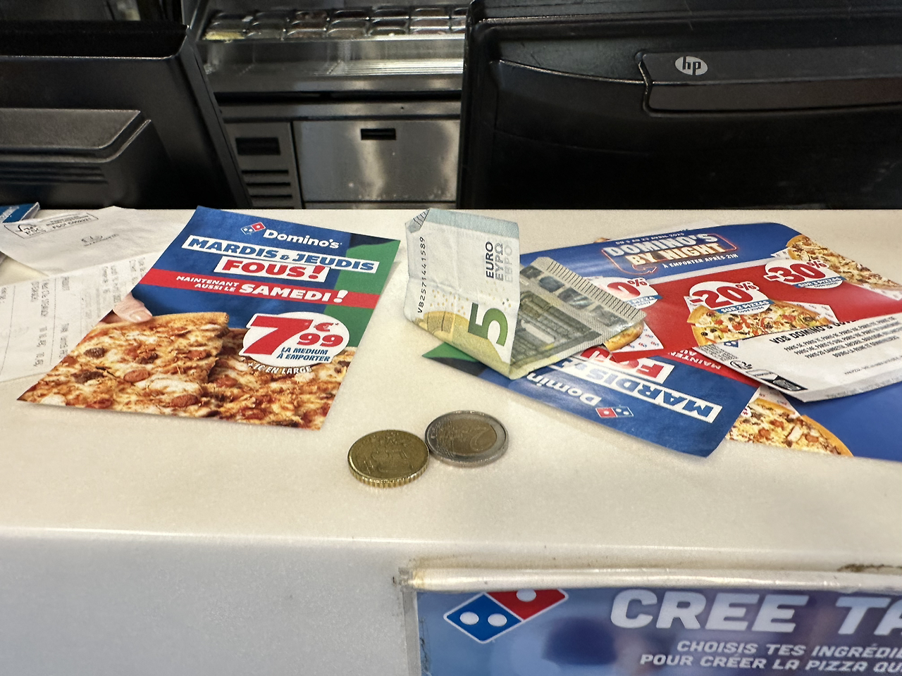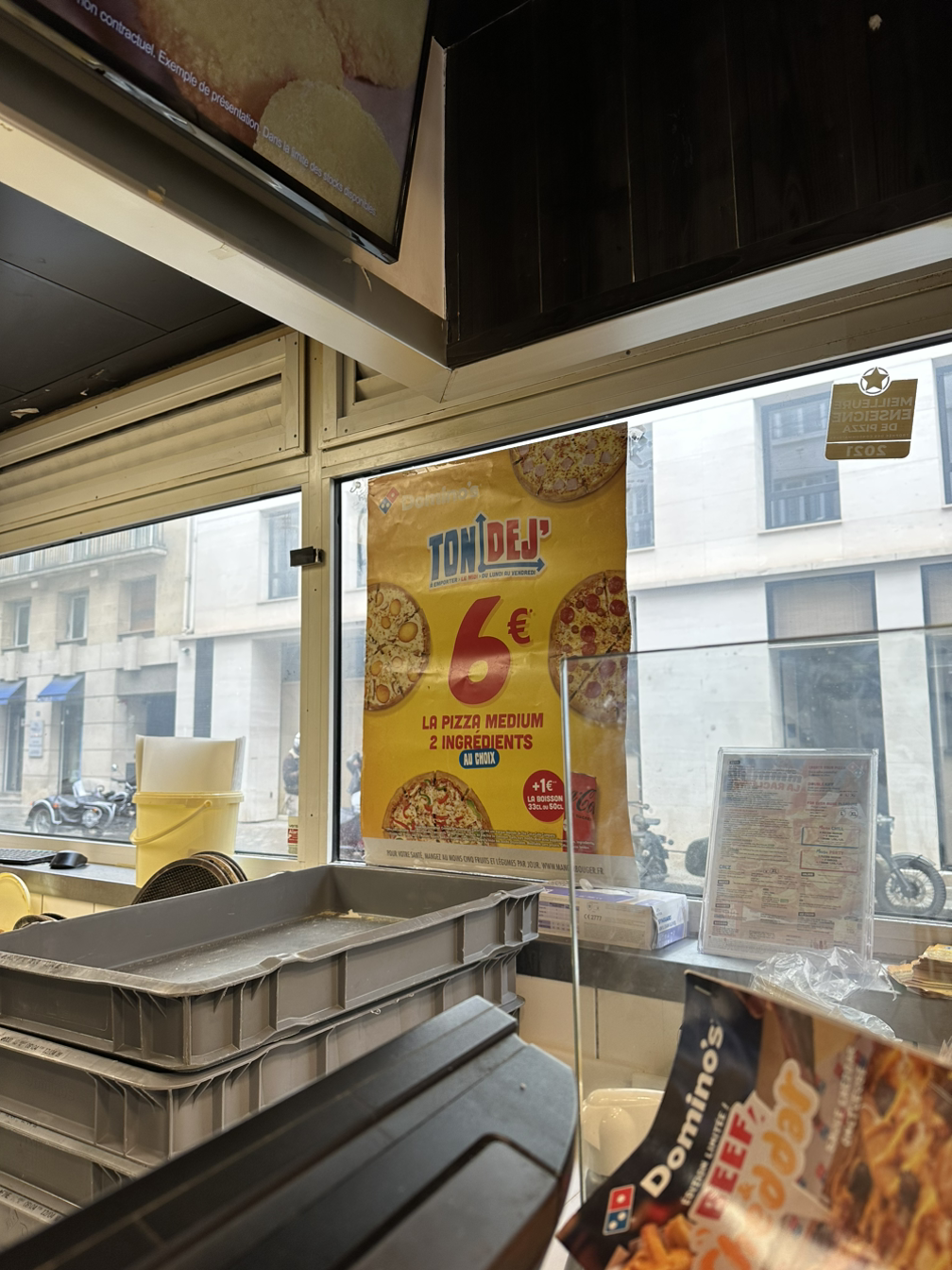 도미노 피자에 들어가니 반겨준다. 6유로짜리 포스터를 가리켰더니 그건 아침한정메뉴란다. 눈앞에 보이는 팸플릿에 7유로짜리 피자를 가리켰더니 그건 내일 진행되는 프로모션 가격이란다. 메뉴판을 보고 제일 저렴한 7.5유로짜리 햄피자를 주문했다. 10분 만에 따끈따끈한 피자가 나왔다.