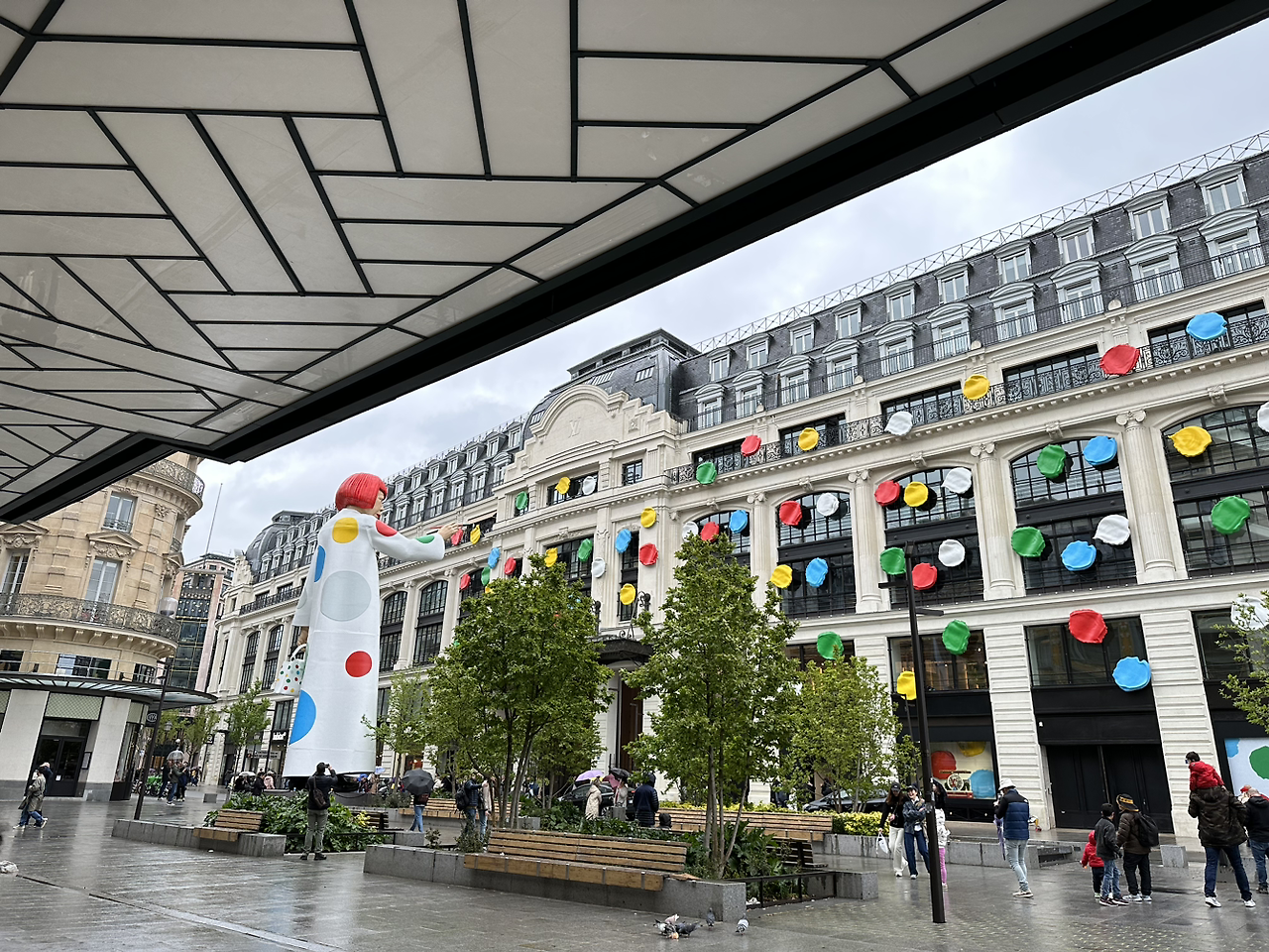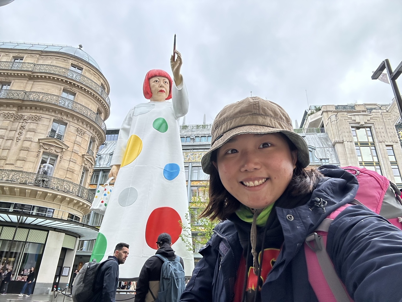 시내에서 에펠탑을 가려면 센강 쪽으로 걸어가야 한다. 퐁네프다리 직전에 루이뷔통매장에서 아주 큰 쿠사마야요이 전시동상이 보였다. 그녀는 노란 호박에 검정땡땡이 작품으로 잘 알려진 작가다. 멀리서 보기에도 세상 화려하고 웅장해서 가까이 가서 기념사진을 남겼다. 다채로운 색감으로 붓칠 하는 모습을 표현해 두었는데 무지개색 우산을 쓴 부부가 지나가서 하나의 그림처럼 잘 어울렸다.