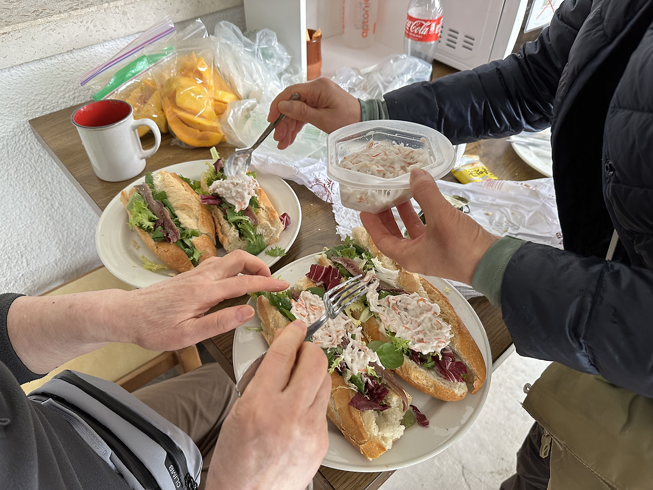 간단하게 버스를 타기 전 장본 재료로 샌드위치를 만들어먹었다. 스페인은 왜 이렇게 바게트가 겉바속촉인지 맛이 좋다. 샐러드채소 묶음, 마요네즈 범벅된 게맛살샐러드, 엔초비(멸치) 통조림을 올렸다. 어머니들과 다니니까 좋은 것 빠른 시간 내로 척척 맛있는 음식을 만들어주신다는 거다. 그런 면에서 난 참 운이 좋다!
