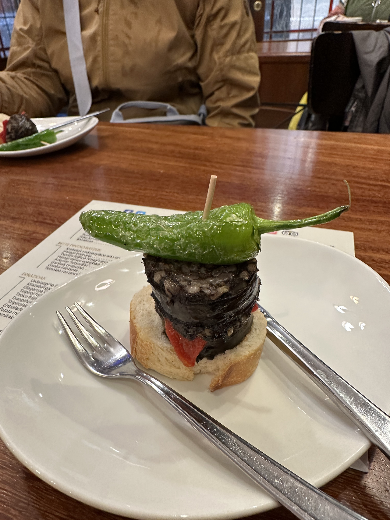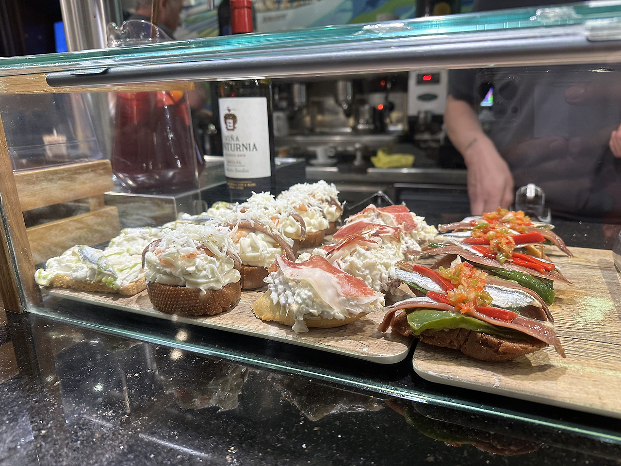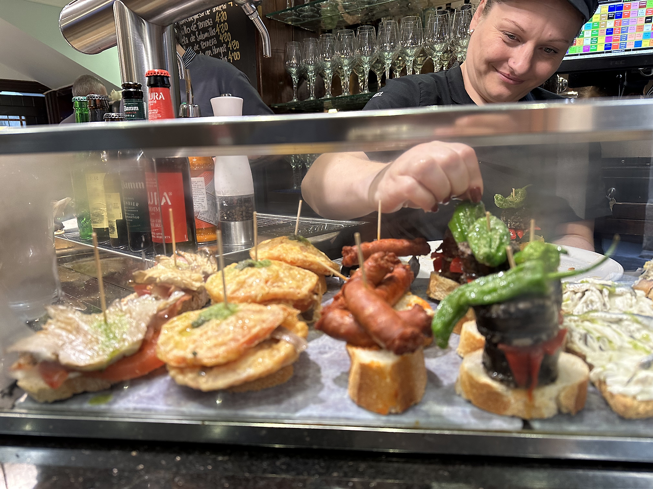에너지 충전을 위해 핀초스 바로 향했다. 핀초는 꼬챙이란 뜻으로 조그만 빵 위에 식재료를 토핑 하여 꽂은 것이라고 한다. 바스크 지방에서는 타파스를 핀초스라고 부른다. 갖가지 맛있는 재료들로 꽂혀있는 다 맛있어 보여서 선택장애를 일으킨다. 2가지를 먹어봤는데 계속 리필을 부르는 맛이다. 1개당 2.2유로로 회전초밥뷔페에서 초밥 골라 먹듯 내가 먹고 싶은 핀초스를 조금씩 다양하게 즐기는 재미가 있더라.