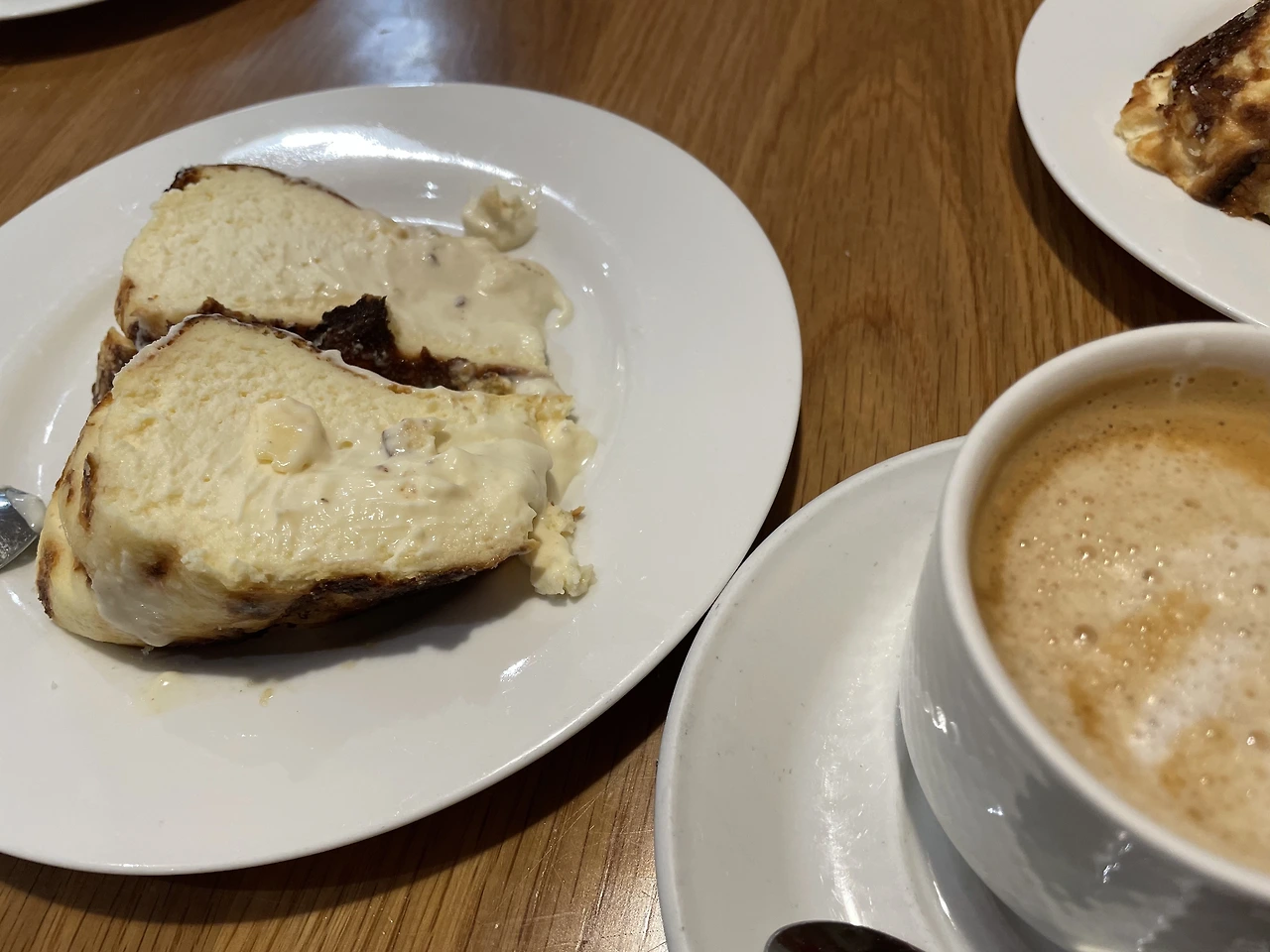 따뜻한 카페라테도 곁들여서 마시니 비바람에 추웠던 것이 조금 해소되었다. 치즈케이크 비주얼과 맛에 감동했는데 배부른 상태에서 디저트로 먹다 보니 마지막엔 좀 느끼했다. 그래도 워낙 찐득하고 깊은 치즈의 맛에 반해 깔끔히 접시를 비웠다.