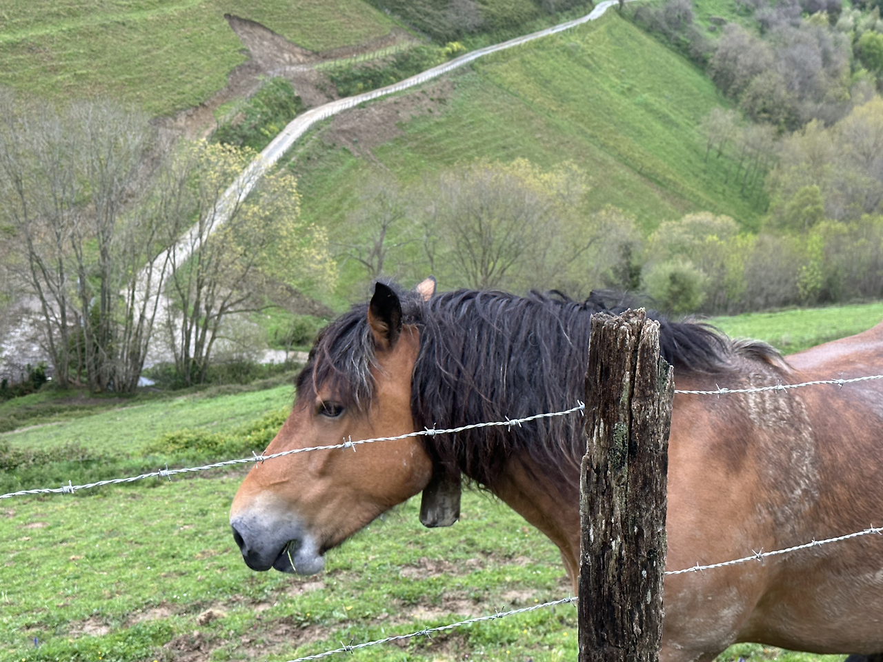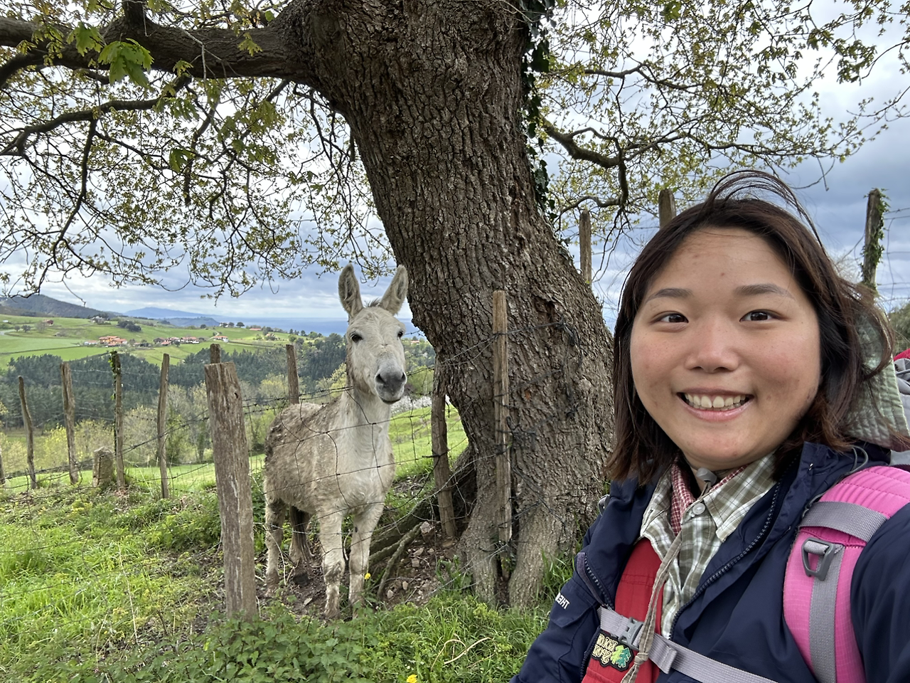 거의 마지막 마을 도착하기 전에 귀여운 말이 우리를 반겨주러 뛰어왔다. 물론 철 울타리가 쳐져서 사회적 거리는 유지된다. 울타리 사이로 빼꼼 얼굴을 내밀고 얼짱 각도를 보여주었다. 사진 찍자는 우리의 요구에 순순이 응해주는 팬 서비스. 덕분에 지친 순례길에서 힘을 얻었다.