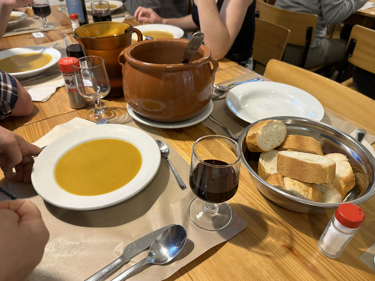 저녁엔 숙소 앞 수녀원 성당에서 미사도 드리고 숙소에서 밥도 먹었다. 관광지라 비싸서 숙소식사가 제일 합리적이다. 와인 한 병을 줘서 세 잔이나 마셨다. 술을 즐기지 않지만 와인이 포함된 식사일 땐 꼭 와인을 마신다. 순례길에서 먹는 와인은 뭔가 좀 특별하다. 힘들게 걷고 마시는 거라 축배의 의미도 있고 스페인 와인이 참 맛있다.