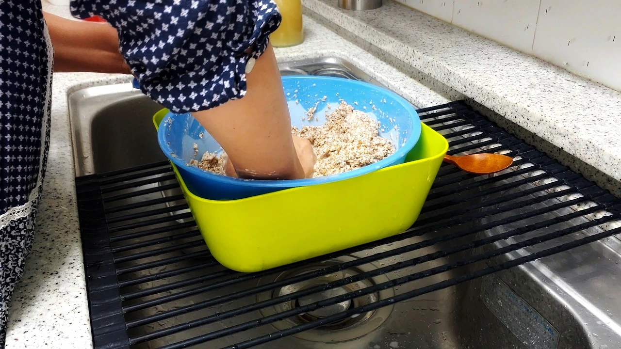 고운 체에 쏟아붓고 물을 더해가며 걸렀다.
