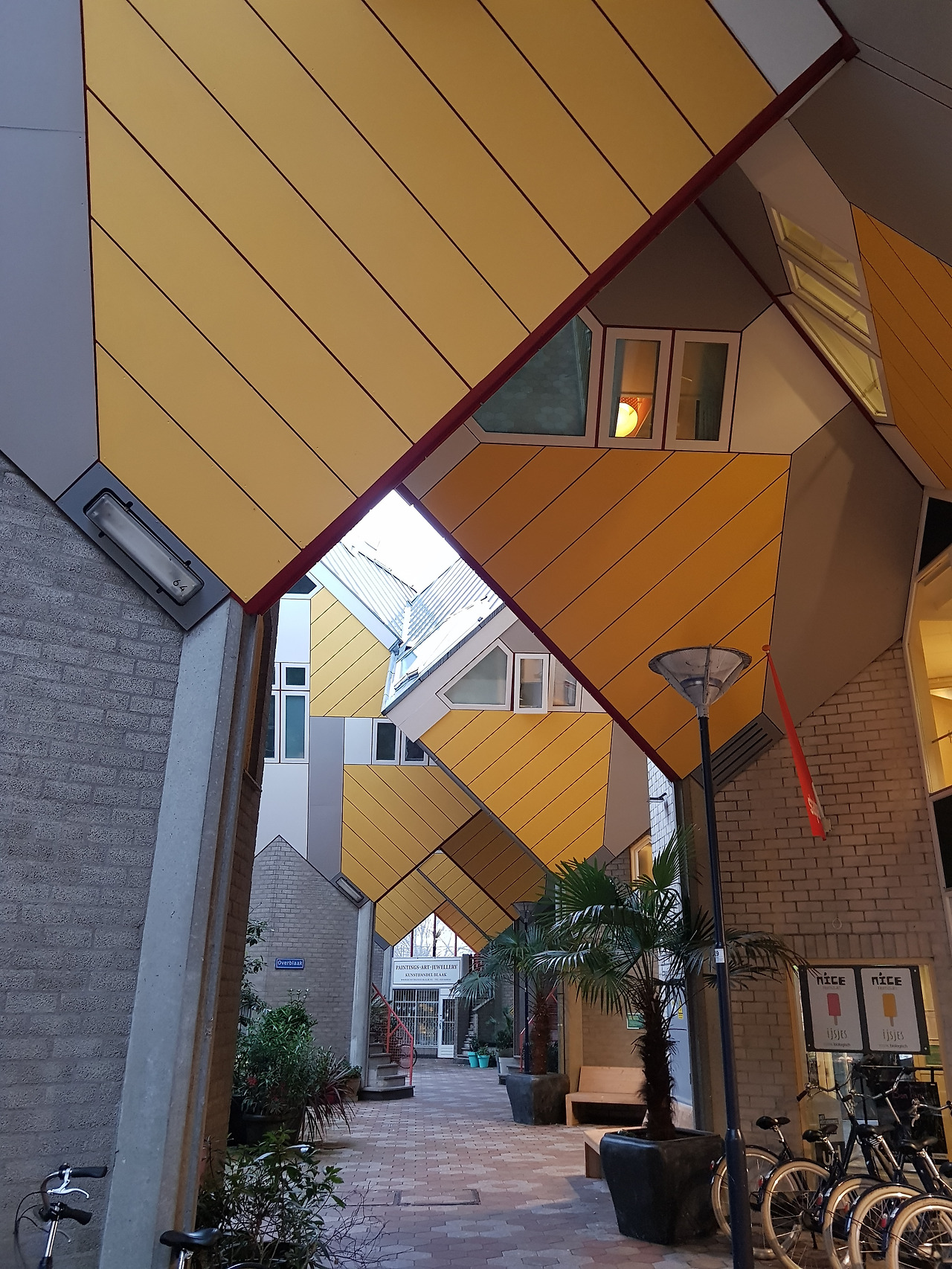 짧은 구경을 마치고 마켓홀을 나오니 바로 큐브하우스가 있었다. 45도로 기울어진 정육면체를 붙여 넣은 듯한 건물로 나무가 가득한 숲을 모티브로 세워졌다고 하는데 현재는 사무실과 거주지로 사용되고 있다고 했다.