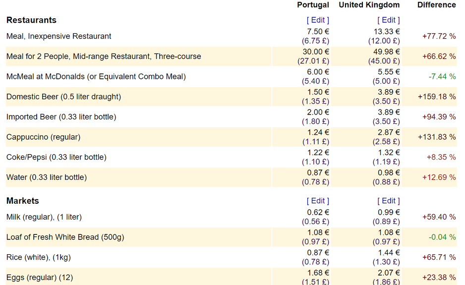 Restaurant Prices(식당 가격) in United Kingdom are 65.97% higher than in Portugal