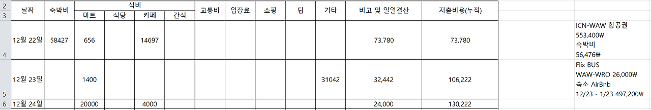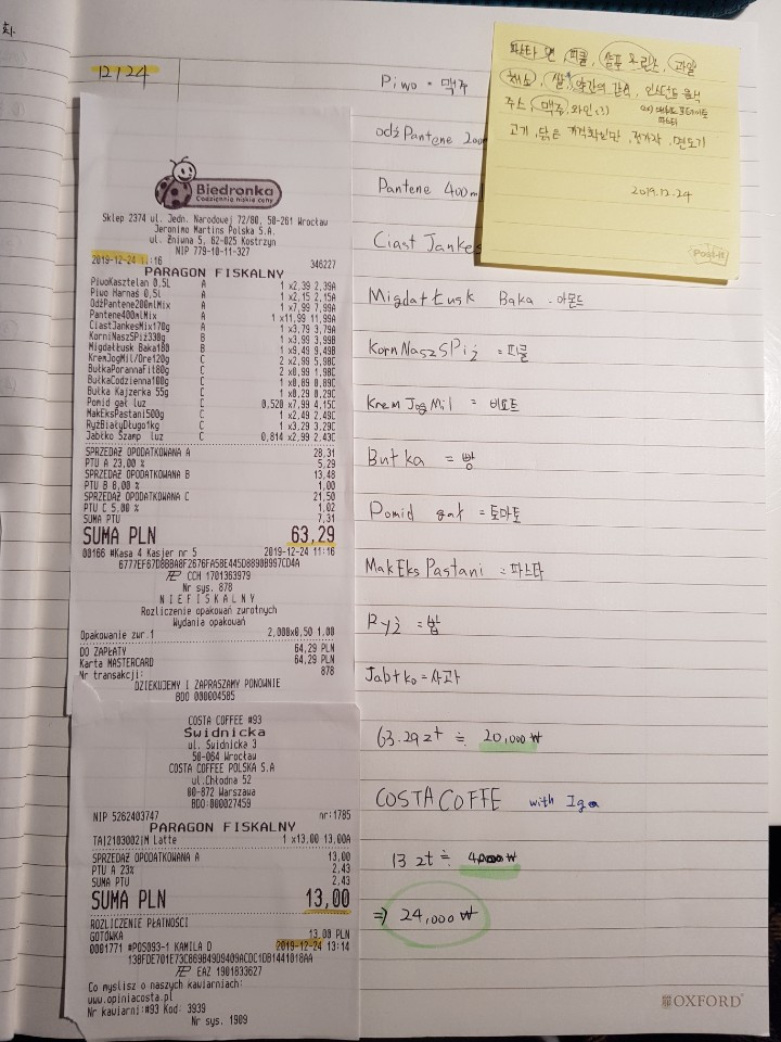 넣을 건 넣고 정리를 한 후 바로 가계부를 작성했다. 가계부를 작성하면서 영수증에 있는 몇몇 폴란드어 단어들을 찾아 적었다. 예를 들어 맥주 Piwo, 쌀 Ryż, 토마토 Pomid, 사과 jabłko. 아주 기본적인 단어지만 슈퍼에서 헤매지 않기 위해 만발의 준비를 했다.
