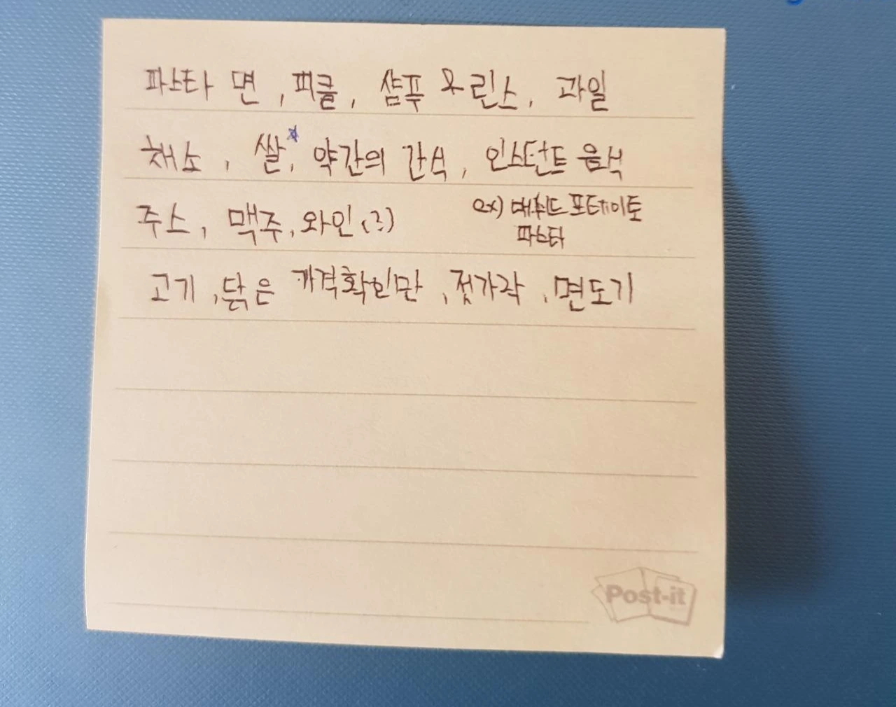 곧장 책상에 앉아 살 것들을 쭉 적었다. 파스타 면, 피클, 샴푸&린스, 과일, 채소, 쌀, 약간의 간식, 인스턴트 음식 ex) 매쉬드포테이토, 파스타 등등