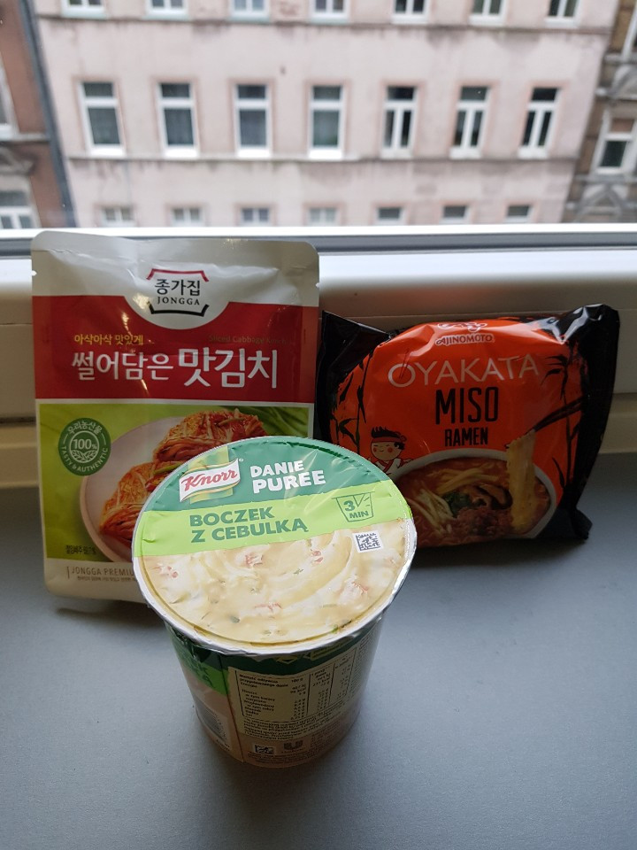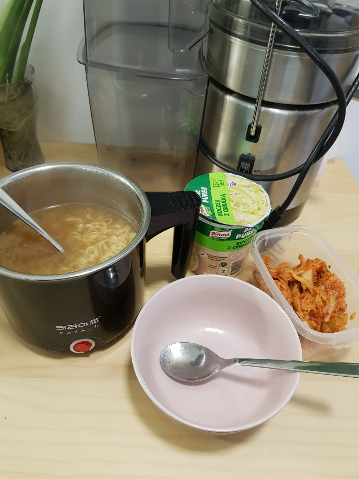 점심메뉴로는 팩으로 담긴 맛김치와 편의점 일본 라면 그리고 매쉬드 포테이토. 일본 라면 특성상 얼큰한 맛은 없지만 미소된장 특유의 깊고 진한 국물이라도 충분했다.