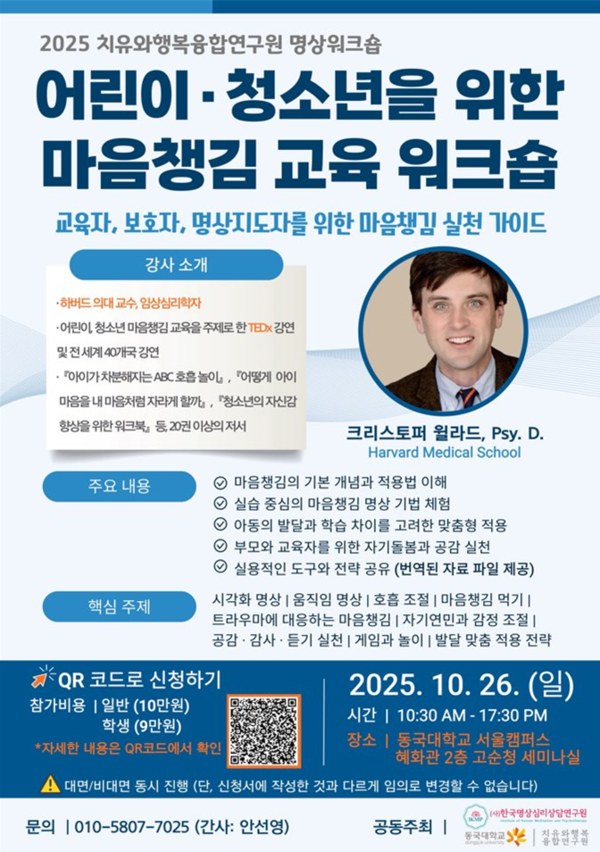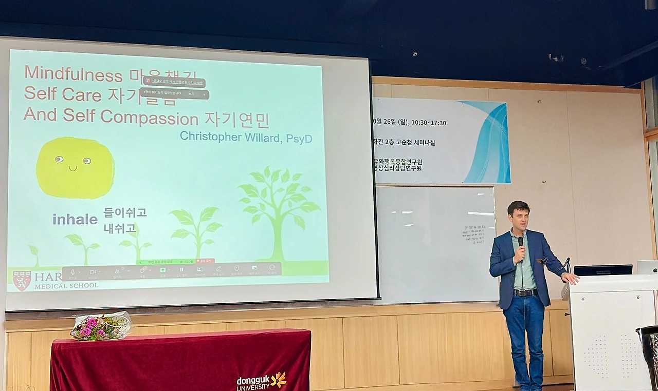 열심히 강의를 들어보고자 대면 참석으로 신청했기에 크리스토퍼 윌라드 교수를 직접 만날 수 있는 기회를 얻었다. 참으로 눈이 맑고, 에너지가 밝은 분이셨다. 워크숍 당일 마라톤으로 인한 교통통제 이슈로 살짝 지각하셨는데, 그때의 당황스러운 마음을 마음챙김과 자연스럽게 연결하여 유머러스한 에피소드로 풀어내는 여유로움이 인상적이었다. 나도 혹시나 학교에 지각하게 된다면 당황하고 스트레스받기보다는 교수님처럼 여유로운 자세로 내 상황 자체를 또 하나의 마음챙김 교육 소재로 승화시켜야겠다고 다짐했다.