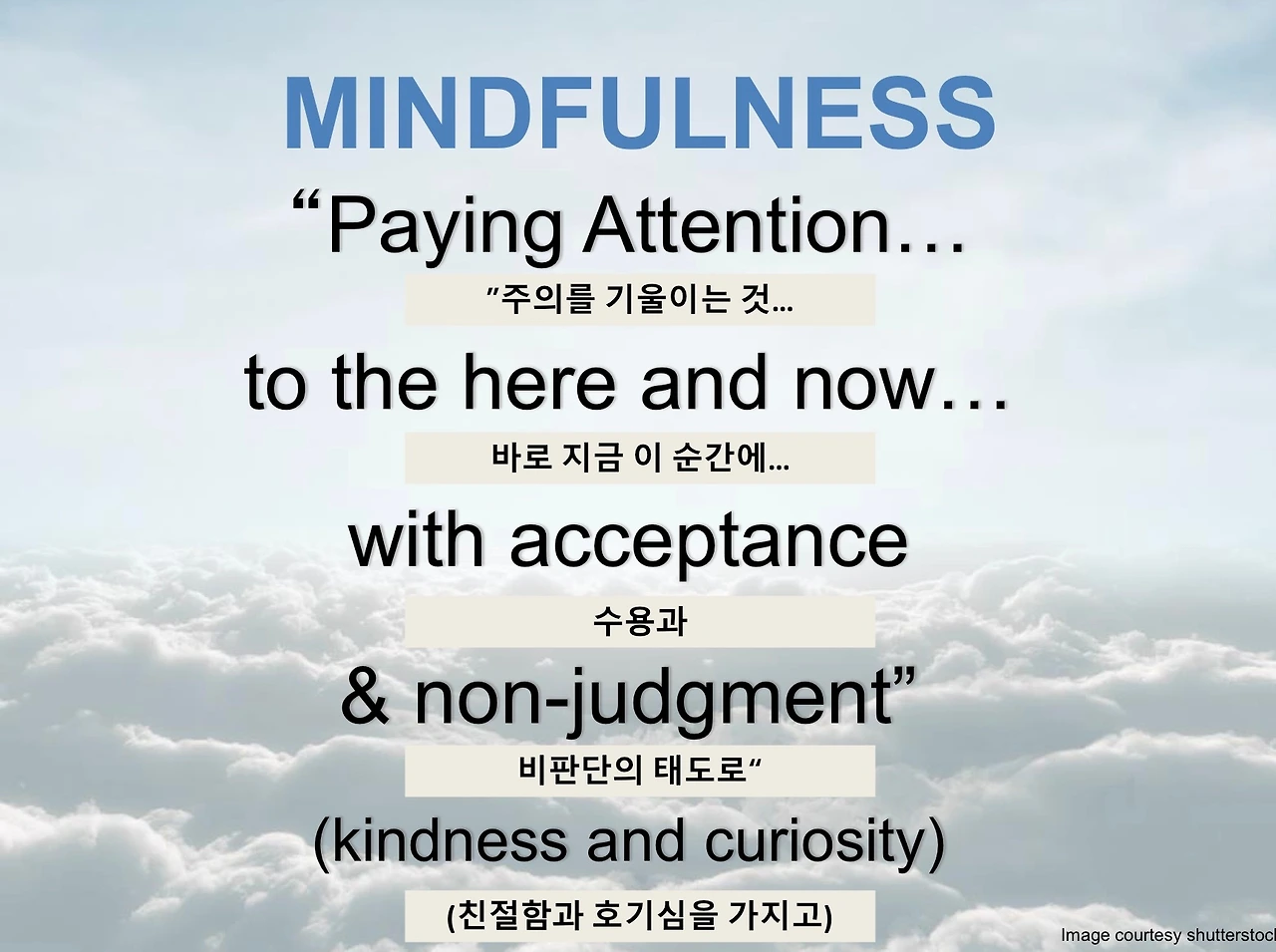 비판단적 태도 : 우리 모두에게는 내면의 비판자가 있다. 특히 주위를 많이 의식하는 청소년들에게는 더욱 가혹한 내면의 비판자. 내 마음이 경험을 가혹하게 판단하지 않도록. "The curious paradox is that when I accept myself just as I am, then I change." - Carl Rogers.
