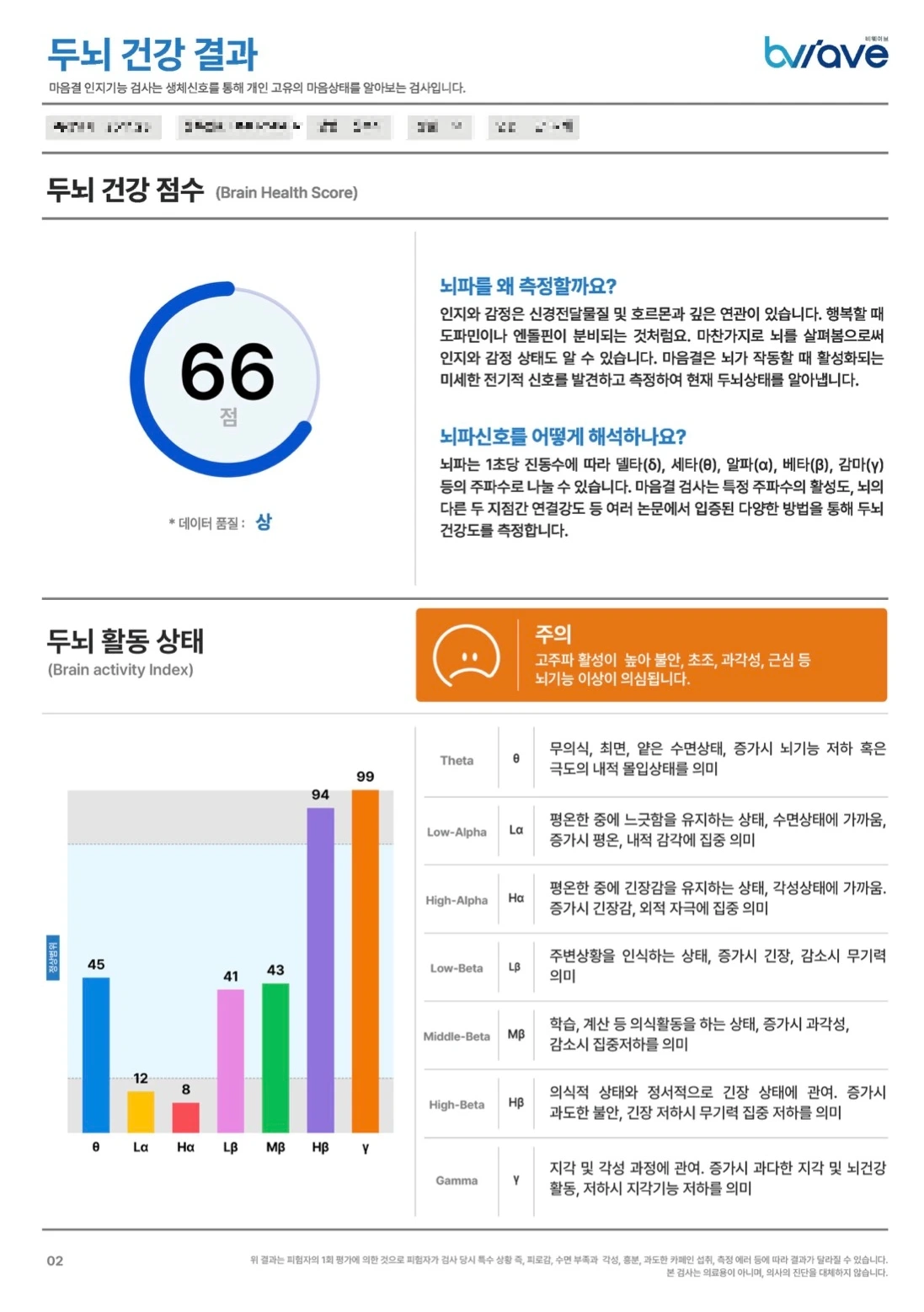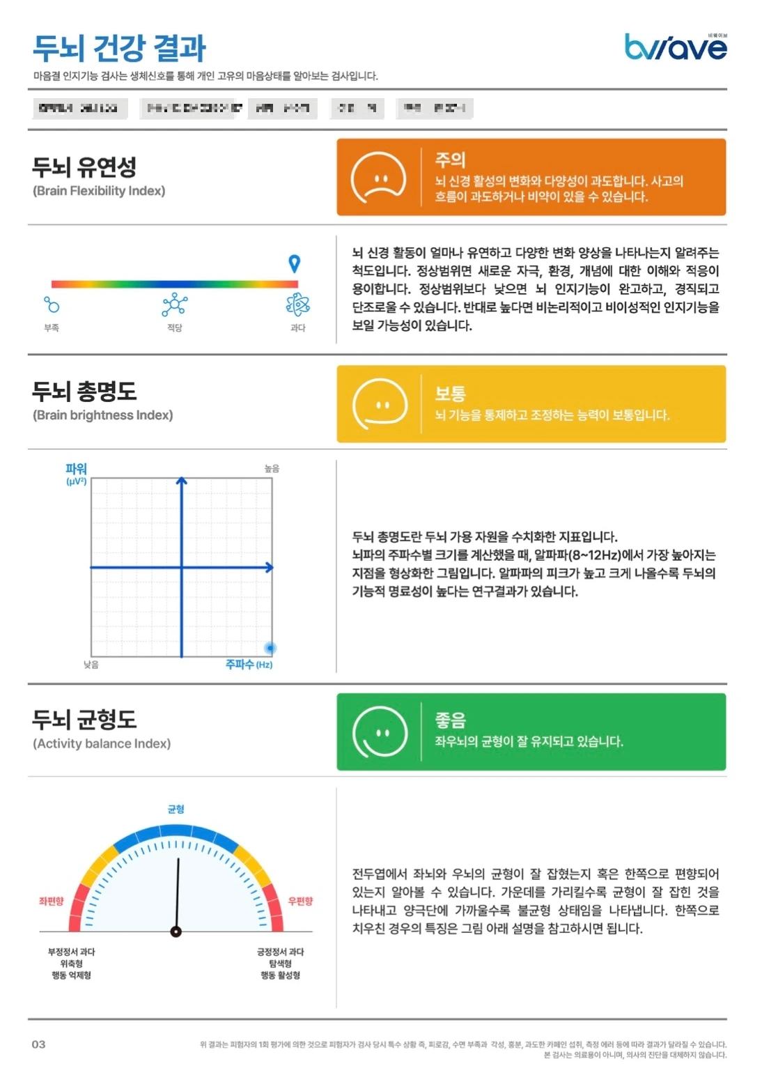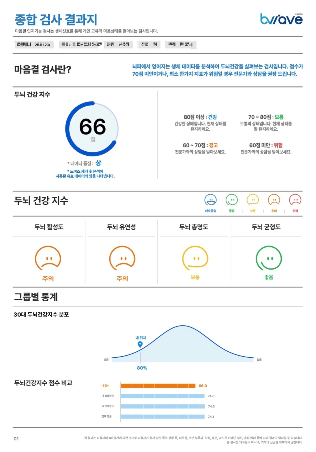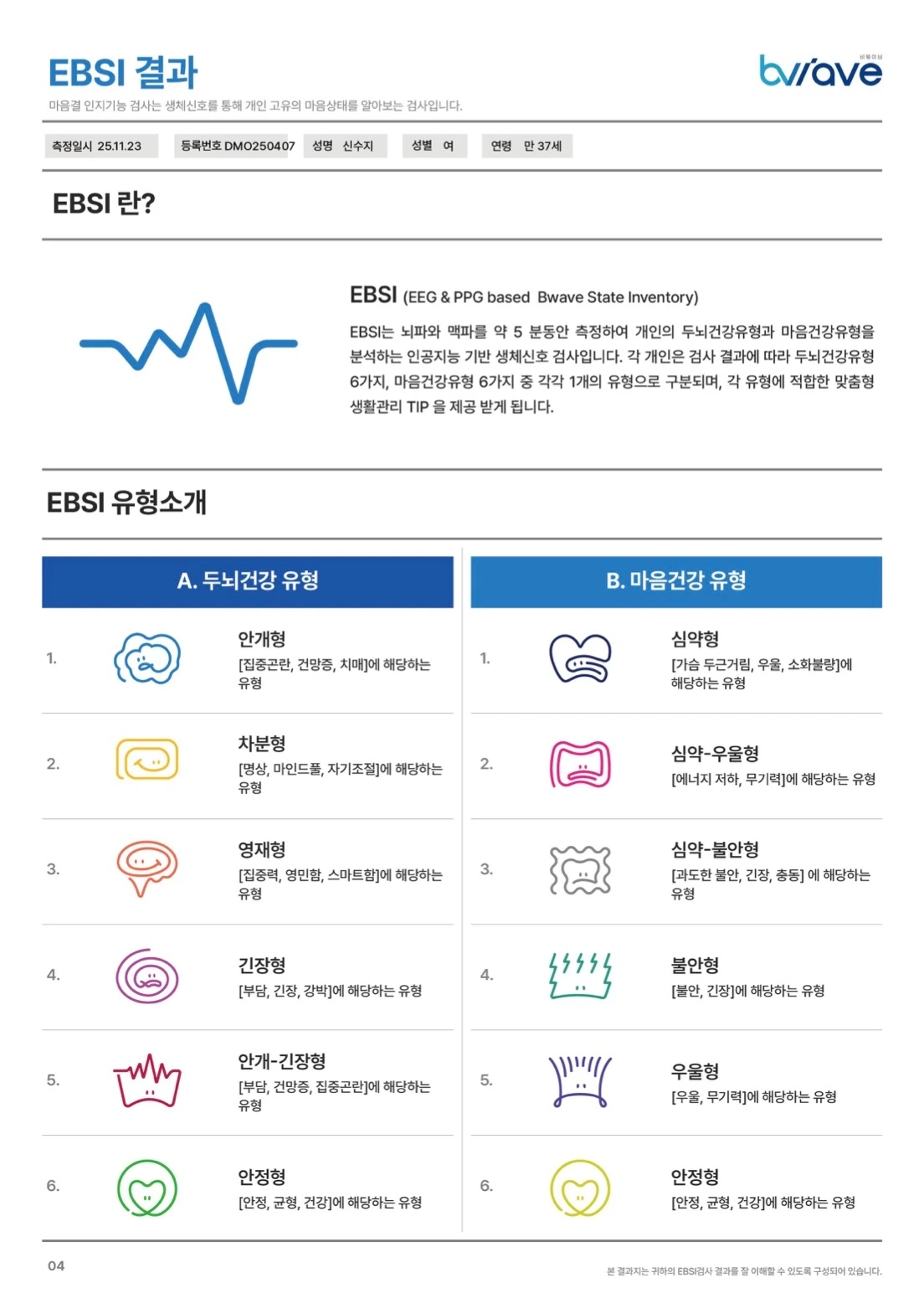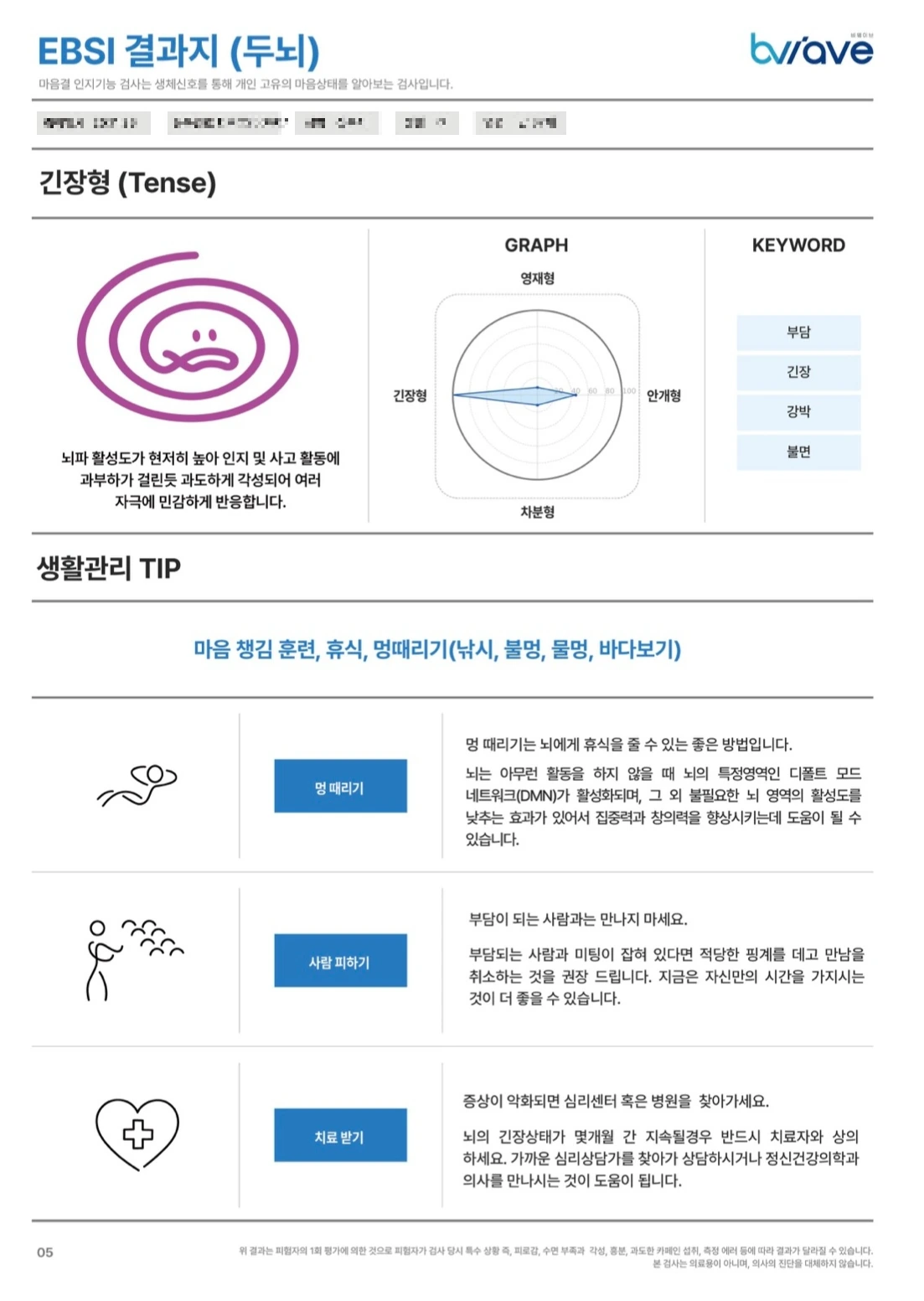 옴니핏만 하고 집에 가려고 했는데, 스님께서 비웨이브 검사도 꼭 받아보라고 권유해 주셨다. 이 검사 또한 뇌파검사로 간단하게 정신건강을 측정해 볼 수 있는 서비스인데, 내가 부스에서 체험한 Basic 코스는 3분 정도 소요되는 설문 조사 후 5분 정도의 뇌파검사를 진행하고 분석과 결과 리포트를 바로 받아볼 수 있었다. 심리검사로는 한국형 우울 불안 설문지(MHS:D, MHS:A)가 이용되고, 뇌파검사로는 전두엽 2 채널 뇌파센서, 귓볼 맥파 센서를 이용해 생체 데이터가 수집된다고 한다. 이렇게 측정한 검사 결과를 바탕으로 피험자의 두뇌건강과 마음 건강을 6가지 유형으로 분류하고, 각 유형별 생활 관리 팁을 제공해 준다. 비웨이브 | 정신과 마음이 건강한 사회를 만드는 기업