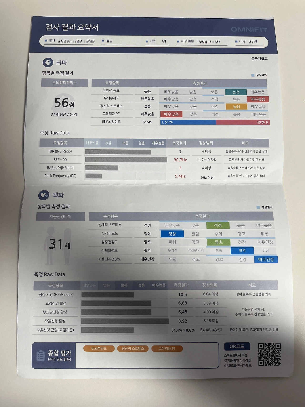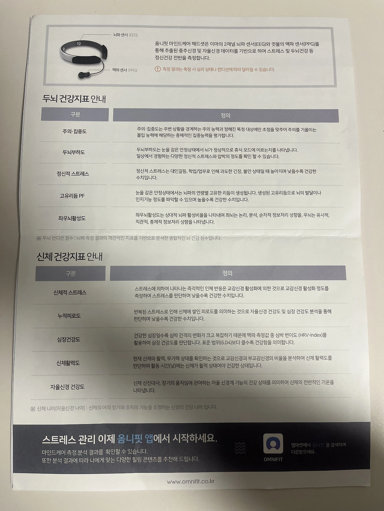 먼저 했던 검사의 기기는 뇌파, 맥파의 생체신호를 측정하여 스트레스 및 두뇌건강을 분석하고 분석된 결과에 따라 치유와 훈련 콘텐츠를 제공하는 정신건강 관리 솔루션이다. 옴니핏 [Better Mind, Better Life]