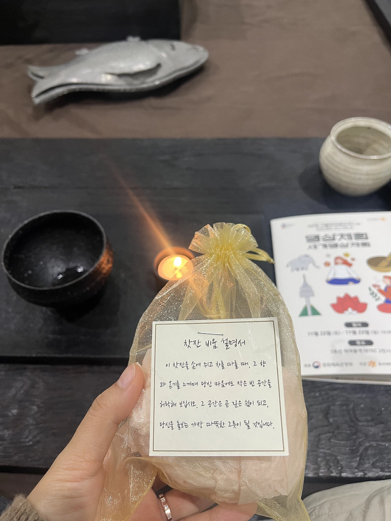 가장 처음으로 했던 체험은 차 명상이었다. 엄마가 오랫동안 다도를 배우셨고 내가 개인적으로 소장한 다기도 많은 편이라 나름대로 다도 경험치가 높지 않나 생각을 했었는데, 아주 큰 착각이었다. 내가 이제껏 다도라고 생각했던 방식은 그 순서와 형식에 너무 얽매여있었던 것 같다. 차 명상에는 구색이 다 갖춰진 다기가 필요한 것이 아니었다. 차를 천천히 음미하는 그 과정 자체가 명상이라는 이해만 있다면 찻잔 하나로도 마음챙김 할 수 있는 것이 차 명상이었다. 이날 배운 차 명상은 마음이 유난히 불안하고 긴장감이 올라올 때면 종종 따라 하고 있다.