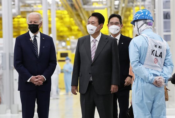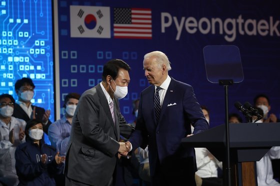 - 네, 바로 그런 협력에 꼭 필요한 핵심 기술을 상징하는 대표적인 산업 바로 반도체 분야이죠. 그래서, 바이든 대통령이 한국에 오자마자 찾아간 곳이 평택 삼성 반도체 공장이었습니다. 거기에서 직접 한미 정상이 공장을 둘러보고, 이재용 회장과 대화도 나누는 모습을 보여줬는데요. 지금 미중 갈등, 또 러시아 전쟁 등으로 공급망이 깨지고 있다는 얘기는 너무 많이 나오고 있잖아요. 이에 대한 보완책으로 한미 간 협력을 거론한 거죠.