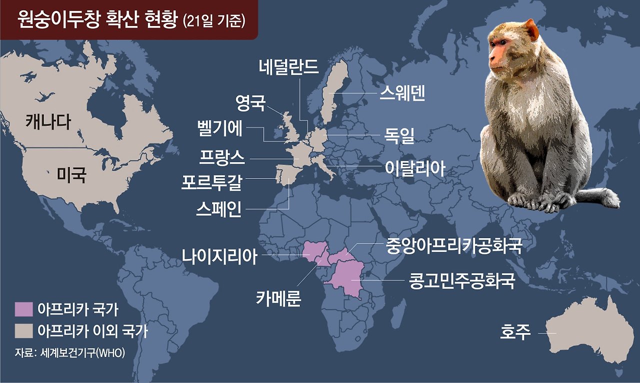 원숭이 두창은 유럽과 아메리카 대륙 중동까지 세를 넓히고 있습니다. ( 출처 : 동아일보 )
