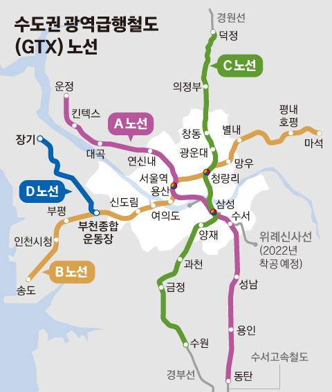 - GTX가 뭔지 잠깐 설명해드리면요. 좀 더 정확하게는 수도권광역급행철도죠. 서울과 경기권을 빠르게 연결하겠다는 구상으로 지난 2009년 공식 제안된 철도 노선입니다. 지금 이미 공사 시작한 곳도 있죠. 자, 그런데 이 GTX가 처음에는 A노선이랑 B노선만 있었거든요. 그런데, 이게 논의 과정에서 C노선까지 추가됐고요. 부동산 가격이 오르면서 관련 대책이 계속 거론되면서 D노선, 여기에 대선을 거치면서는 E노선에 F노선까지 늘어났었습니다.