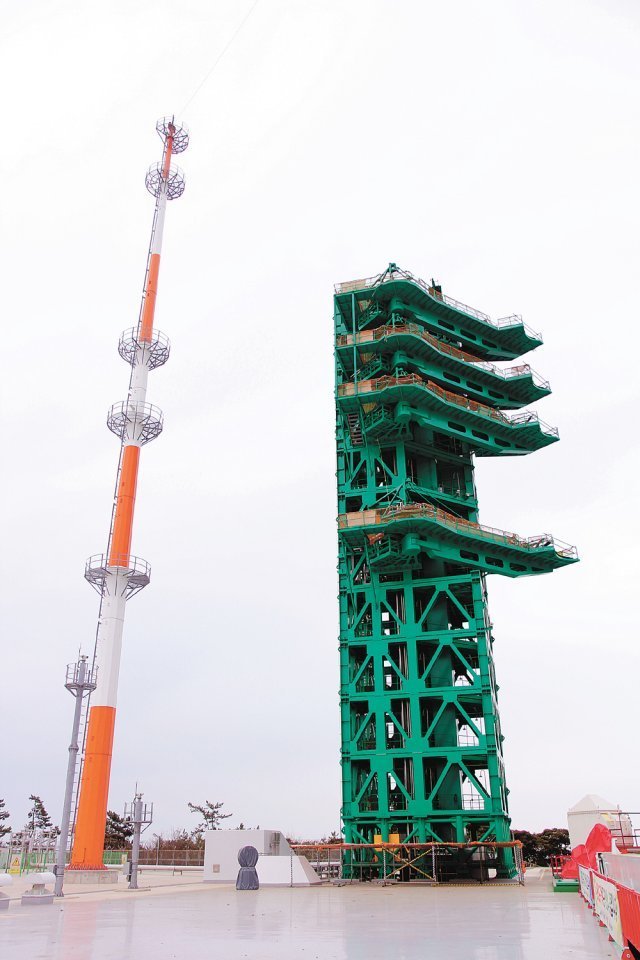 저 초록색으로 우뚝 서서 누리호에 연료와 전기 등을 주입해주는 이른바 탯줄 장치가 엄빌리컬 타워입니다.