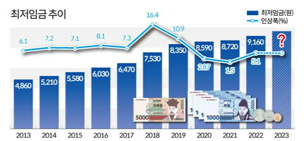 - 사실, 최저임금은 지난 2018년에는 16.4% 그리고 2019년에는 10.9% 올랐었거든요. 그러다가 코로나 국면을 맞으면서 2020년 2.9%, 지난해에는 1.5%로 인상률이 떨어졌었는데요. 이후, 물가 상승세와 함께 5%대 인상률을 보이게 됐습니다. 그럼에도 노동계는 여전히 물가 상승률에도 못 미치는 인상률이라고 지적했고요. 사용자 측은 한계에 몰린 소상공인, 중소기업이 감당하기 어려운 수준이란 반응을 내놨습니다.