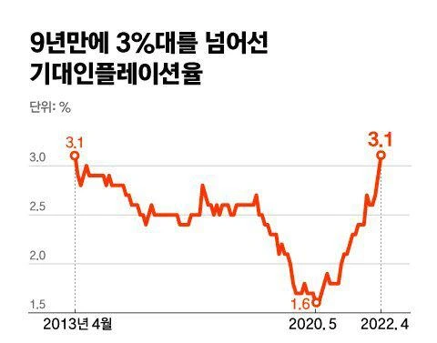 - 그렇다 보니까 기대인플레이션율 상승은 전반적으로 임금 인상을 부추길 수 있고요. 실제로, 주요 대기업 노조에서 임금 인상 요구 나오고 있죠. 이렇다 보니까 추경호 기재부 장관은 대기업에 임금 인상 자제해 달란 요구까지 했다는 얘기도 어제 해드렸잖아요. 지금, 다 연결된 이야기고요.