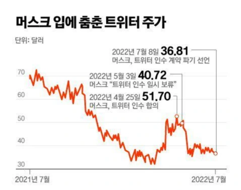 - 일단 머스크 측은 트위터가 사업 실적을 제대로 공개하지 않았다는 등의 이유를 대고 있는데요. 일단, 지난 4월이랑 지금이랑 트위터 주가가 차이가 크거든요. 30% 넘게 하락했습니다.