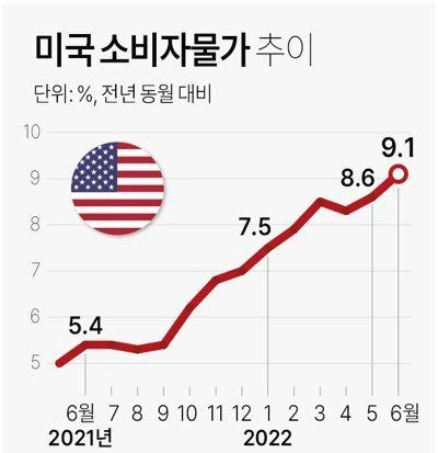 - 네, 어젯밤에 미국의 6월 소비자물가가 발표됐는데요. 얼마가 나왔냐. 바로, 9.1%를 기록했습니다. 중동 전쟁을 인한 오일쇼크 당시 1980년 이후 41년 만에 역대 최고 수준입니다.