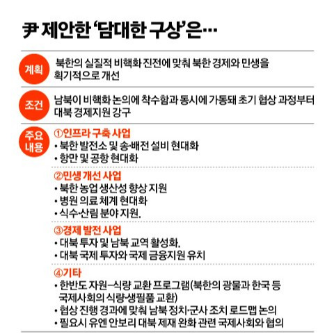 - 윤석열 대통령이 어제 제77주년 광복절 경축사에서 밝힌 대북 정책입니다. 핵심은 북한이 핵개발을 포기하면 우리가 북한에 포괄적인 개발원조를 제공한다는 내용을 담고 있습니다. 원래 지난 취임식 때, '담대한 계획'이라고 밝혔던 적이 있었는데요. 이게 취임 100일 정도 지나면서 '담대한 구상'으로 구체화된 것으로 보입니다.