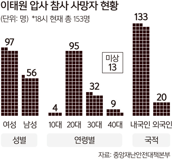 - 네, 여성 사망자가 모두 98명으로 집계됐고요. 남성이 56명이었습니다. 아무래도 압사 사고가 밀려 넘어지는 것이다 보니까 상대적으로 체구가 작은 여성들이 취약하다는 분석이 나왔고요. 사망자 중엔 외국인도 26명으로 집계됐습니다. 사망한 외국인의 국적은 미국, 일본, 중국, 이란 등 14개 국가 외국인이 포함됐고요. 국적별로는 이란인이 5명으로 가장 많았고요. 중국과 러시아가 각각 4명, 미국과 일본은 2명으로 집계됐습니다.