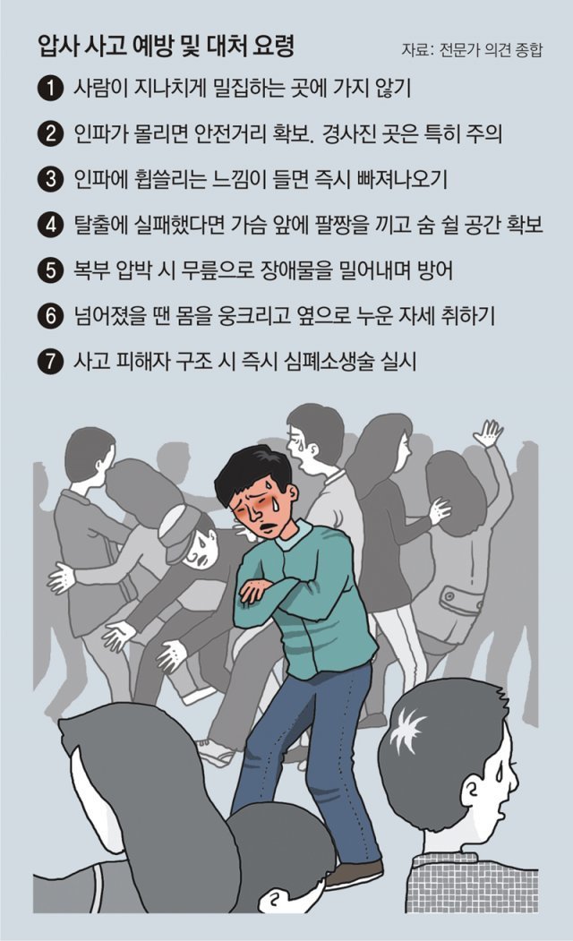 - 일단, 결론부터 말씀드리면 이번 이태원 참사와 같은 사고의 경우에는 일단 상황이 벌어진 뒤에 개인이 예방할 수 있는 뾰족한 방법은 없다는 게 많은 전문가들의 의견입니다. 그렇기 때문에 인파가 몰리는 곳 자체를 피하는 게 방법일 수밖에 없는데요. 그래서, 사람이 많은 곳일수록 질서 있게 좀 느리게 가더라도 엉키지 않도록 주의하는 게 필요합니다.