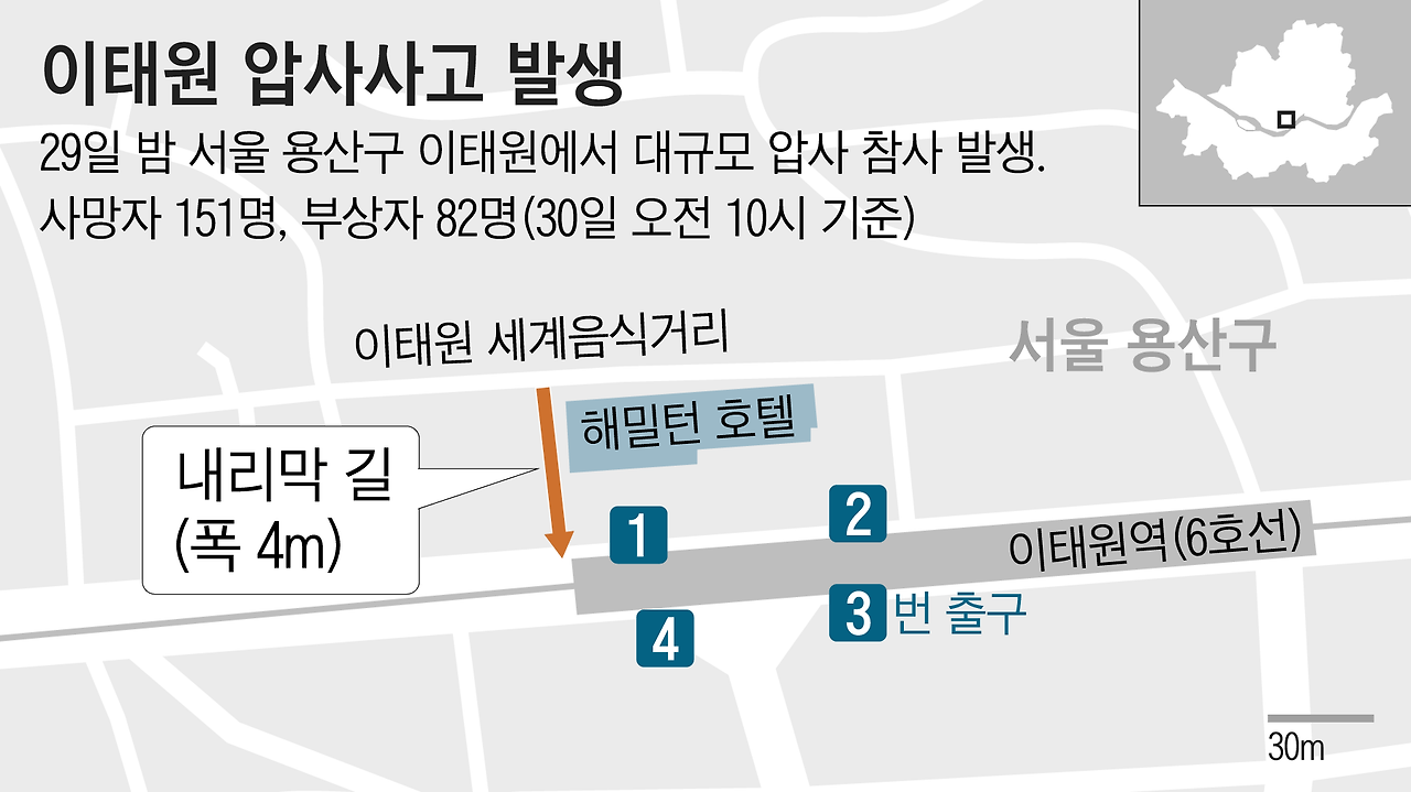 - 일단, 기본적으로는 좁은 골목길에 지나치게 많은 인파가 모인 것이 원인이었고요. 이번에 참사가 발생한 골목길의 길이가 40미터, 폭 4-5미터 내외거든요.