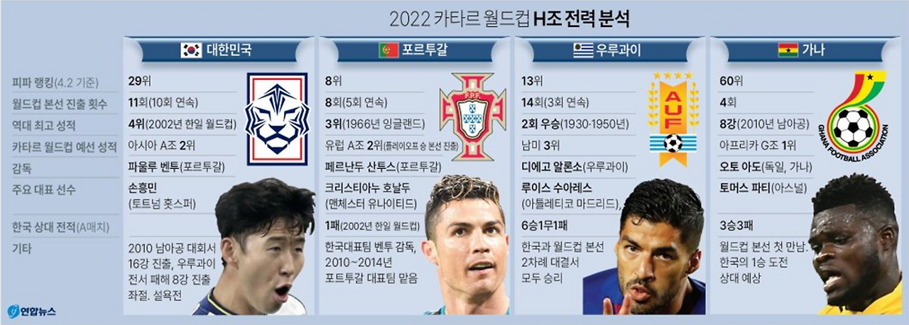 - 맞습니다. 아까 말씀드린 대로 12월 2일 밤, 3일 새벽에 우리 대표팀이라 조별리그 3차전에서 맞붙게 되고요. 우리가 2002년 월드컵 때도 만난 적이 있는데, 그때 박지성 선수가 골을 넣어서 우리가 16강에 올라갔죠.