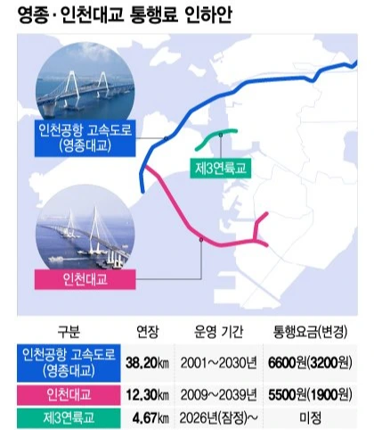 - 그래서, 일단 올해는 영종대교부터 요금을 낮추기로 한 거고요. 인천대교는 금액이 큰 만큼 순차적으로 2025년 말까지 아까 말씀드린대로 5천 원에서 2천 원으로 인하를 하겠다고 발표한 겁니다.