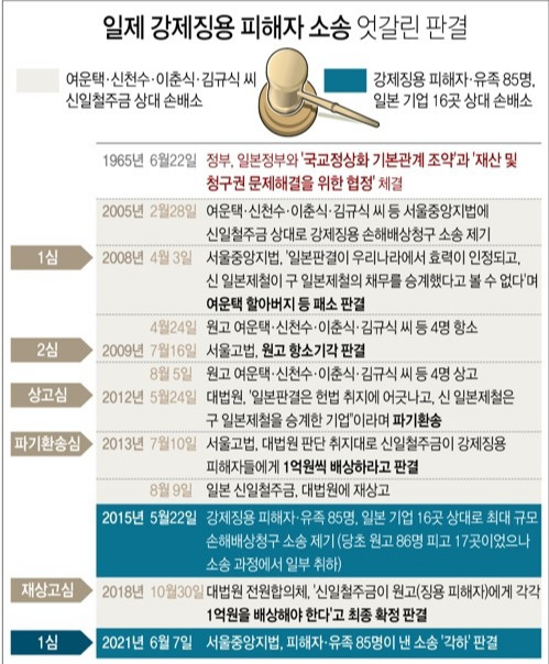 - 2심 고등법원에서는 우여곡절 끝에 원고가 승소합니다. 피해자들에게 1억 원씩 지급하라는 판결이 나오게 되죠. 그런데 일본 제철사는 대법원까지 끌고 가는데요. 문제는 여기서 벌어집니다.
