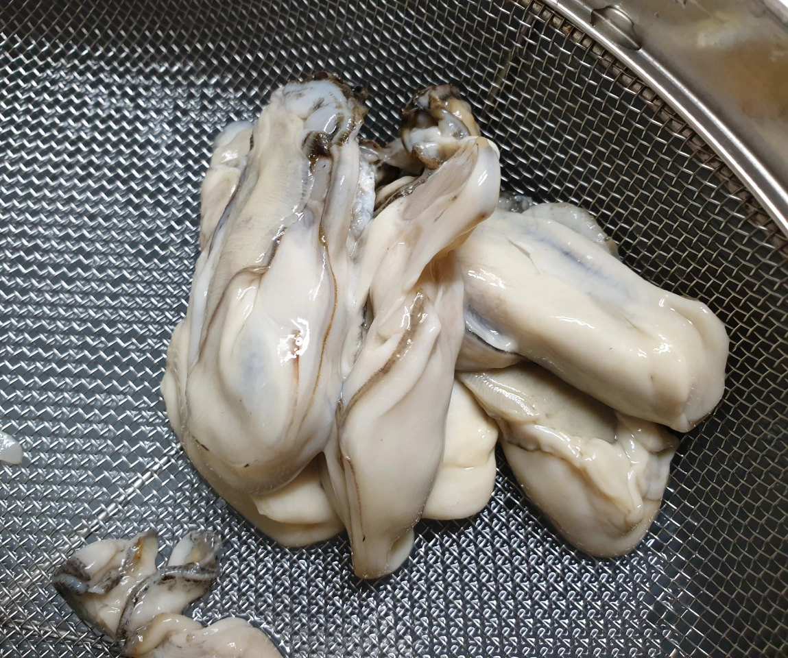 씻는 건 너튜브에서 어떤 먹방인이 말했던 방식대로 식초와 소금을 넣아 살살살 뒤적거리며 같은 방법을 2회 반복했다. 그랬더니 회색 구적 물이 다 나가고 뽀얀 굴이 윤기 좔좔 흐르며 '날 드시오~' 하고 유혹하는 것 같았다. 곧장 큰 놈과 작은놈들을 골라냈다. (거의 반반? 정도 된 것 같다.) 큰 것들은 굴전을 할 예정이었고, 남은 작은 굴들은 일회용 봉투에 담아 굴국을 위해 냉동고에 넣었다. 냉장고에 넣어둬도 바로 먹으면 된다고 하는 사람들이 있었지만 초짜 요리사(?)인 나는 겁이 나서 냉동고로 직행했다. 다음날 무와 배추, 애호박 넣고 해동시킨 굴로 국 끓여 먹었는데 보신탕이 따로 없었다. 쌀쌀한 겨울 연출하려 창문까지 열어두고 호로록 한 숟가락씩 즐기기~이렇게 힐링할 수 있구나 ㅎㅎ