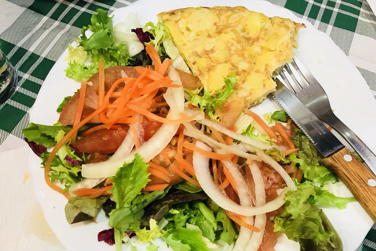 주말 + 인기 관광지로 식당엔 자리가 없었다. 식당 찾기에 연신 실패 후 꾸진 골목을 찾아 자리가 있는 가게로 들어갔다. 돼지의 신이 내렸나 맛 대 성공! 스페인식 감자 오믈렛과 샐러드, 함께 나온 스파이시한 올리브오일과 빵을 흡입했다. 스페인에선 단 한 번도 맛에 실패하지 않는다.