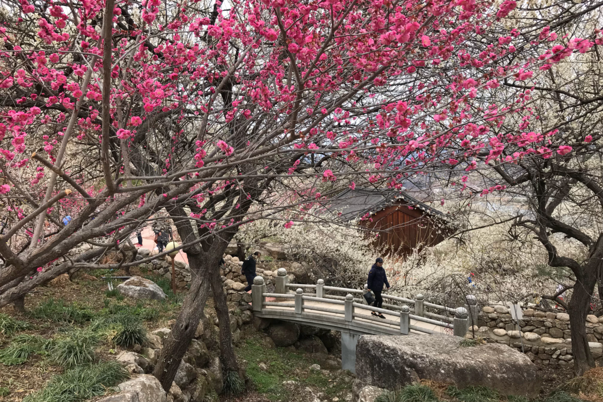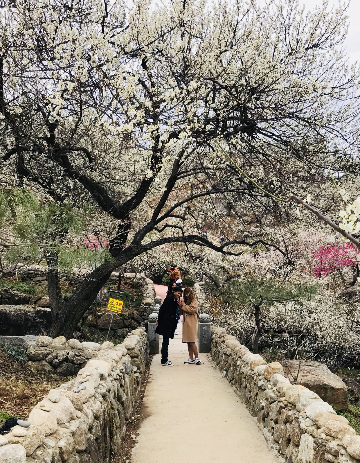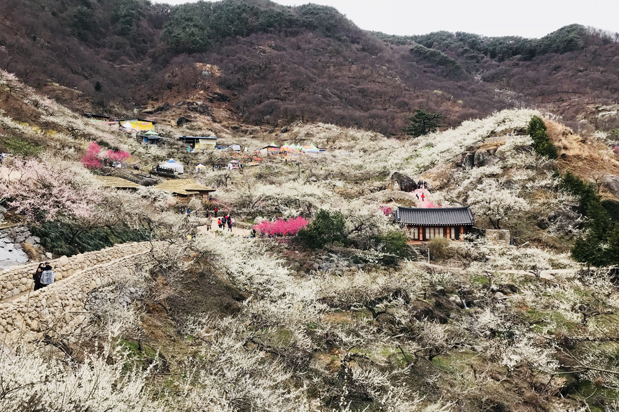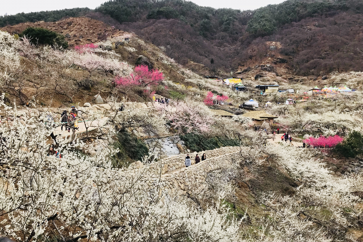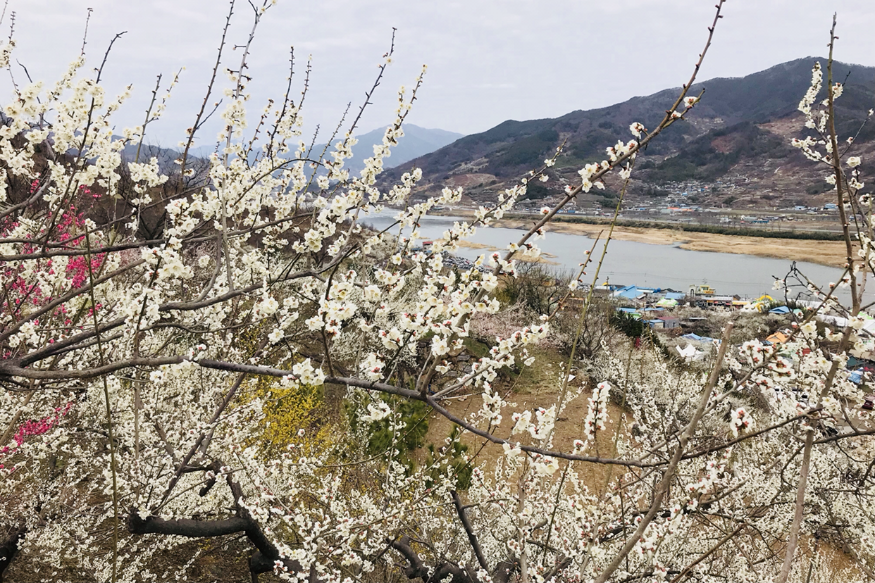 산등성 위에서 바라본 꽃잔치. 벚꽃과 다르게 꽃망울이 작고 만개를 해도 뭉텅뭉텅 핀 모양새다. 하지만 골짜기마다 가득 핀 매화나무는 장관이다. 사진으론 표현 못하고 글로도 표현 못하는 나는 그저 팝콘을 뿌려놨다고 말하겠다. 웰컴 투 동막골에 팝콘 터지는 장면이랄까.