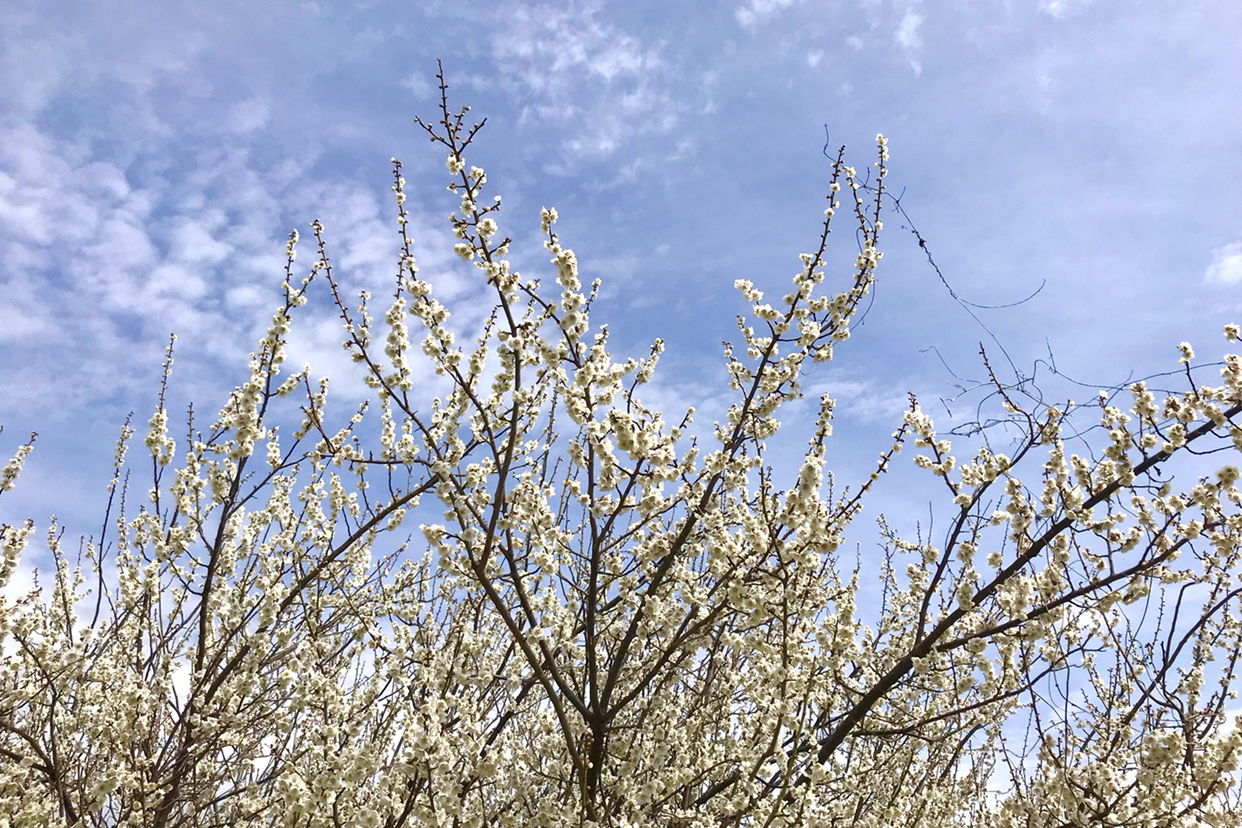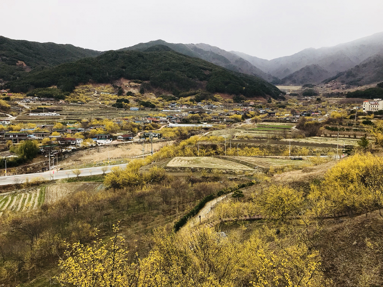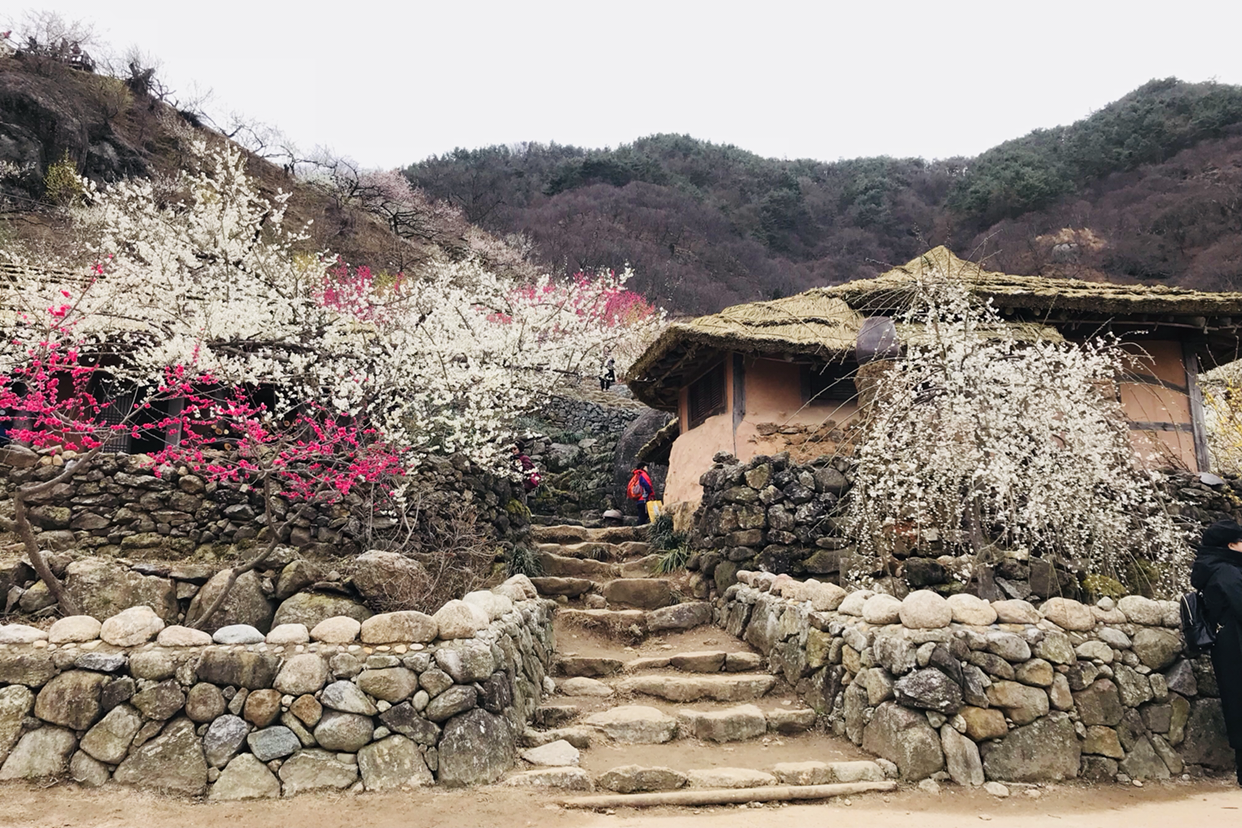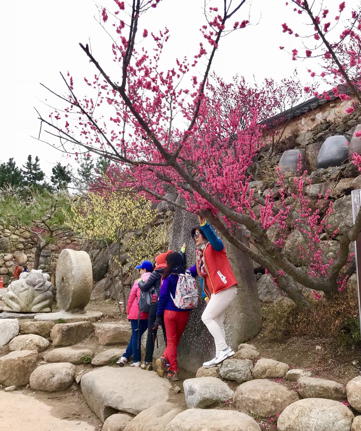 산등성 위에서 바라본 꽃잔치. 벚꽃과 다르게 꽃망울이 작고 만개를 해도 뭉텅뭉텅 핀 모양새다. 하지만 골짜기마다 가득 핀 매화나무는 장관이다. 사진으론 표현 못하고 글로도 표현 못하는 나는 그저 팝콘을 뿌려놨다고 말하겠다. 웰컴 투 동막골에 팝콘 터지는 장면이랄까.