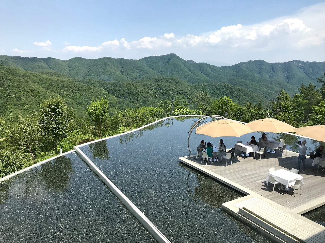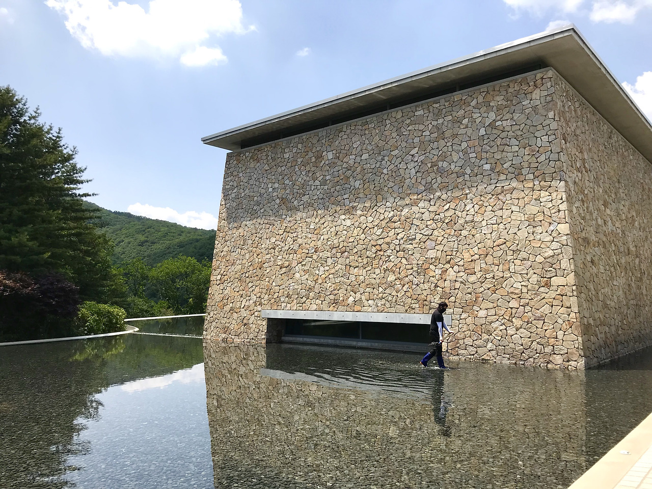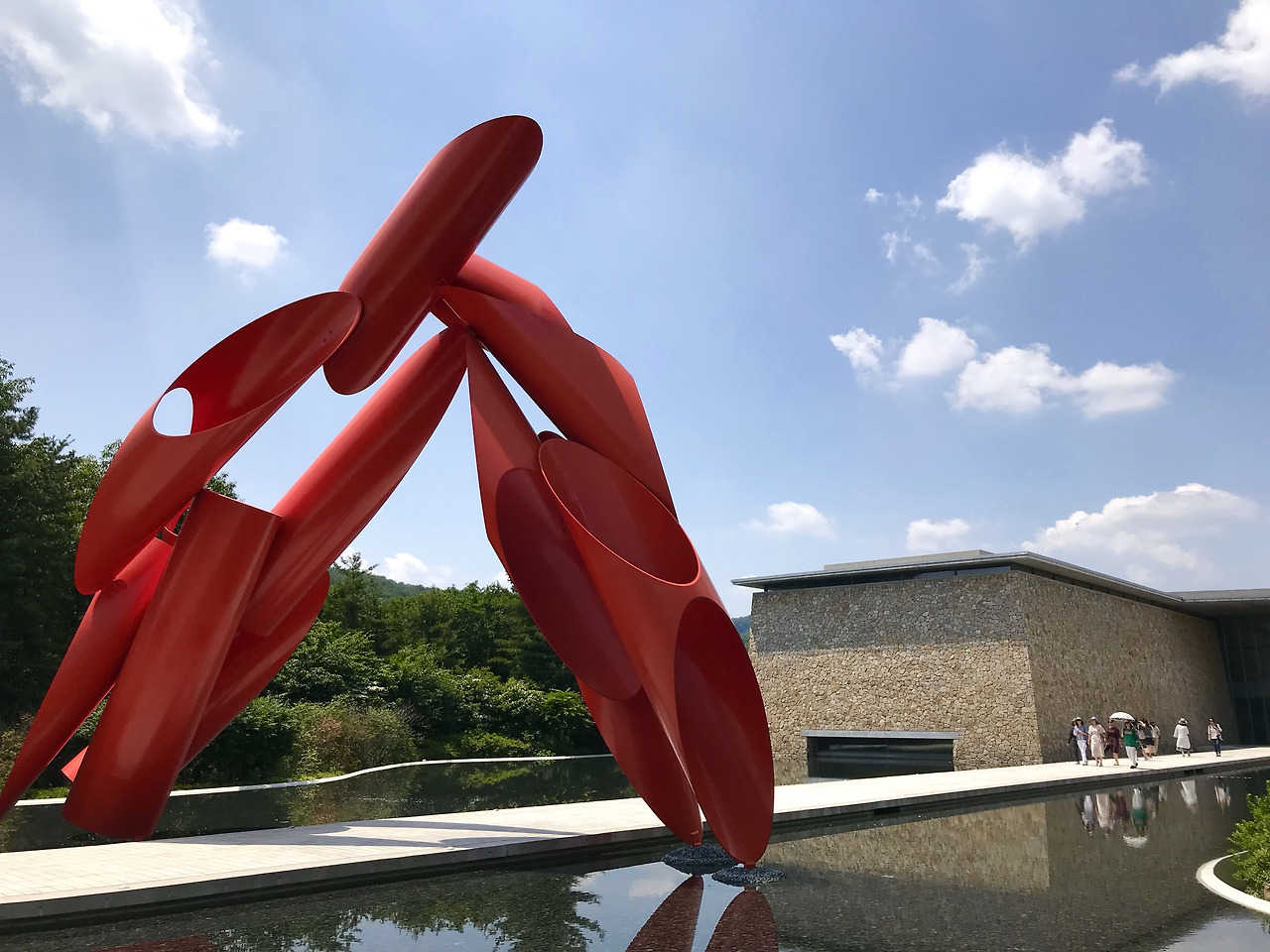 골프장 길을 지나 처음 마주친 뮤지엄산엔 대게가 있었다. 대게를 만든 건 아니겠지만 홍게 발이 생각나는 건 어쩔 수 없는 건가. 대게와 함께 물에 비치는 건축물이 모던하고 단정해서 사진을 한참이나 찍었다. 깔끔한 정원에 비결은 불타는 햇살 속에서 열나게 일하고 계신 분들이 아닐까 싶다. 돌을 평평히 만들고 물에서 낙엽도 건지고 정원에선 할머니 일꾼들이 꽃과 잔디 심고 계셨다. 화이팅!