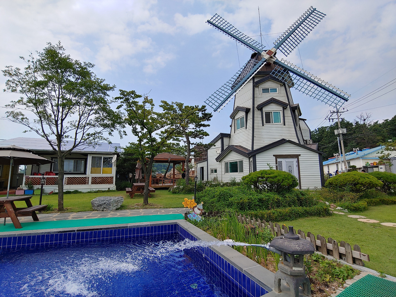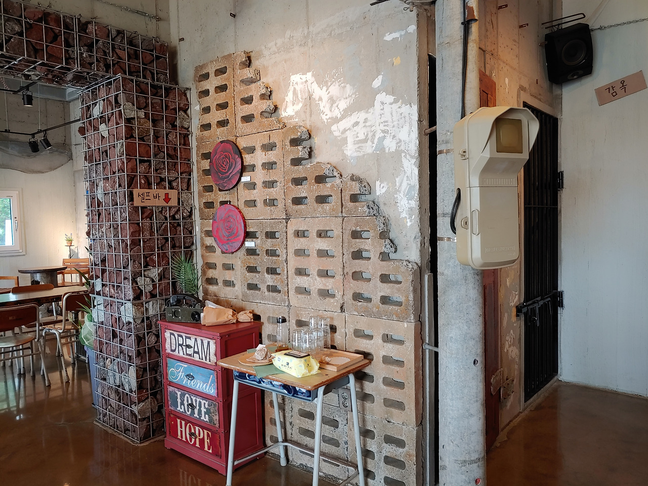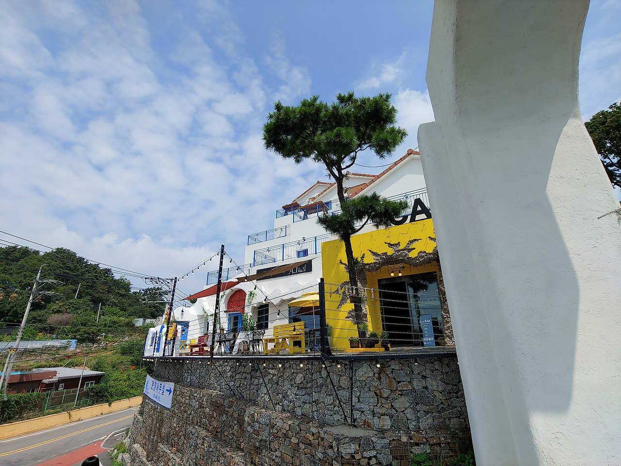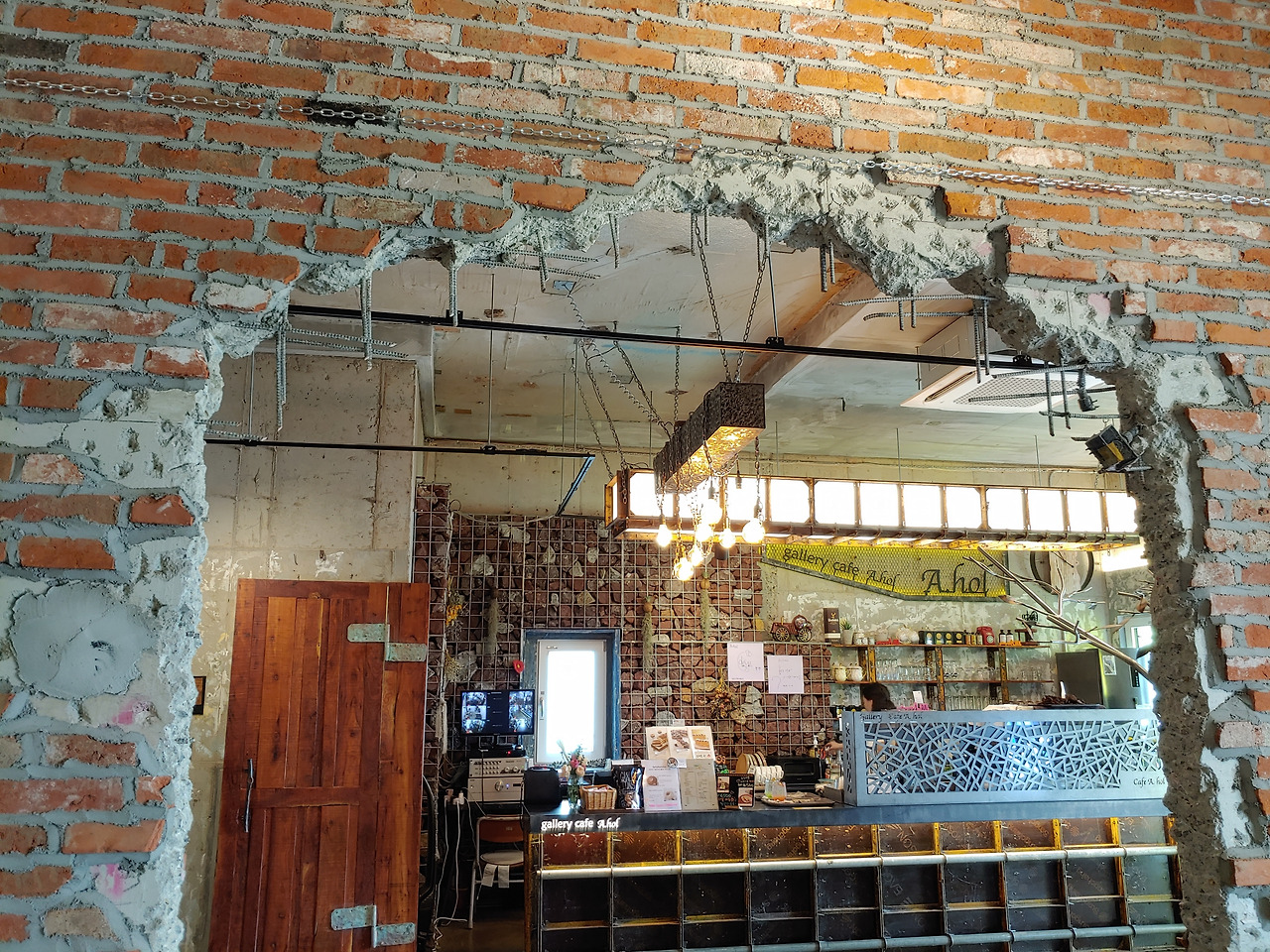 뻘다방 앞 업사이클링 카페 에이홀. 이곳엔 지중해 스타일에 리조트가 지어졌고 그 안에 있는 카페. 대부도 협동조합 이사님 중 한 분이 건축을 해서 건축 폐자재를 암 걸리지 않게(?) 처리하여 업사이클링하였다. 애초 목적은 갤러리였다며 과할 수 있는데 이사님 조카가 알바생으로 일하면서 젊은 감각도 더해져 지금의 공간이 되지 않았나 싶다. 함께 탐방 온 친구들이 인스타용 사진 찍는 모습을 구경했다. 평일이라 사람도 1도 없었고 애기들(?) 사진 찍는 거 구경. 재밌다. 키키키