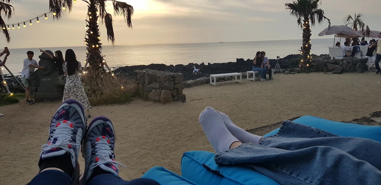 노을을 보기 위해 서쪽 애월로 향했다. 애월은 어마어마했다. GD카페보다 더 거대한 하이엔드 제주라는 자본력이 넘치는 카페가 생겼다. 어제 들었던 난개발이다! 예쁘게 차려입은 사람들이 많았고 인스타 감성사진찍기 대회를 구경했다. 빈백에 누운 내가 심사위원이다. 자 다들 갬성적이게 찍어보거라!