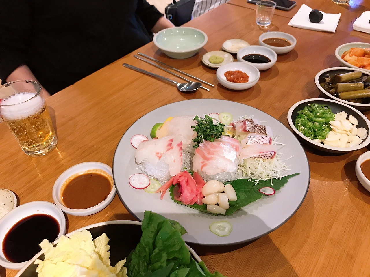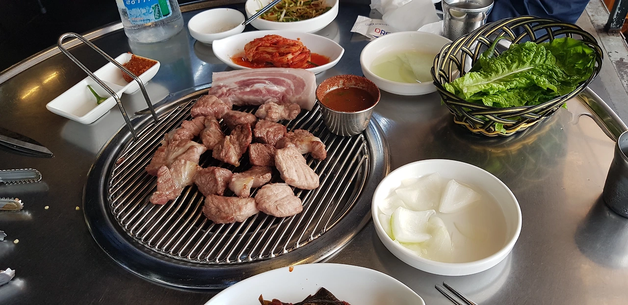 숙소에서 석식을 예약해서 먹었는데 와~ 진짜 맛있음. 약 털어먹는 중인데 회도 안 좋아하는데 돔은 진짜 엄청 맛있다. 제주 흑돼지도 훈남 직원이 계속 구워준다. 밑반찬도 맛나고 배 탈러는 배탈을 무시하고 먹었다고 한다.
