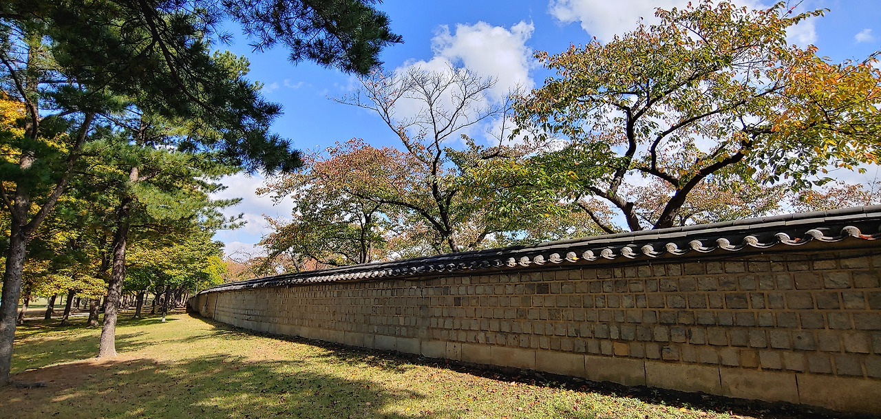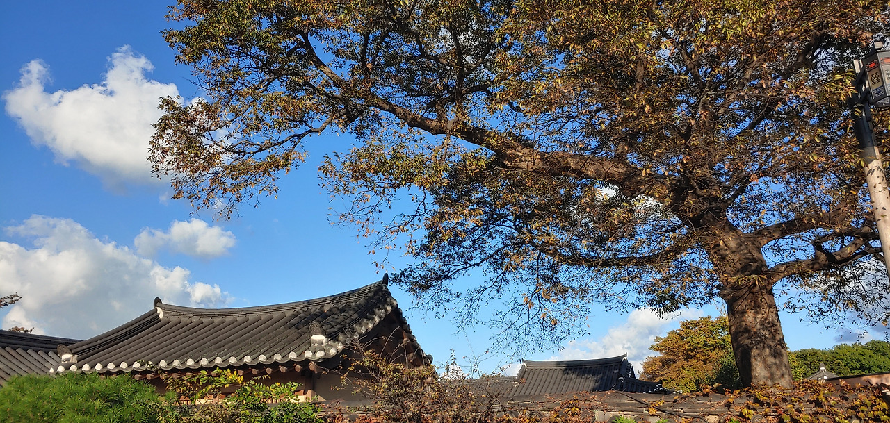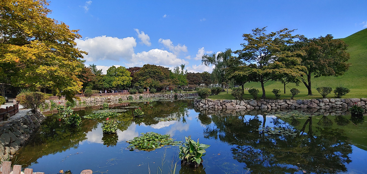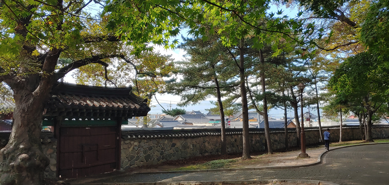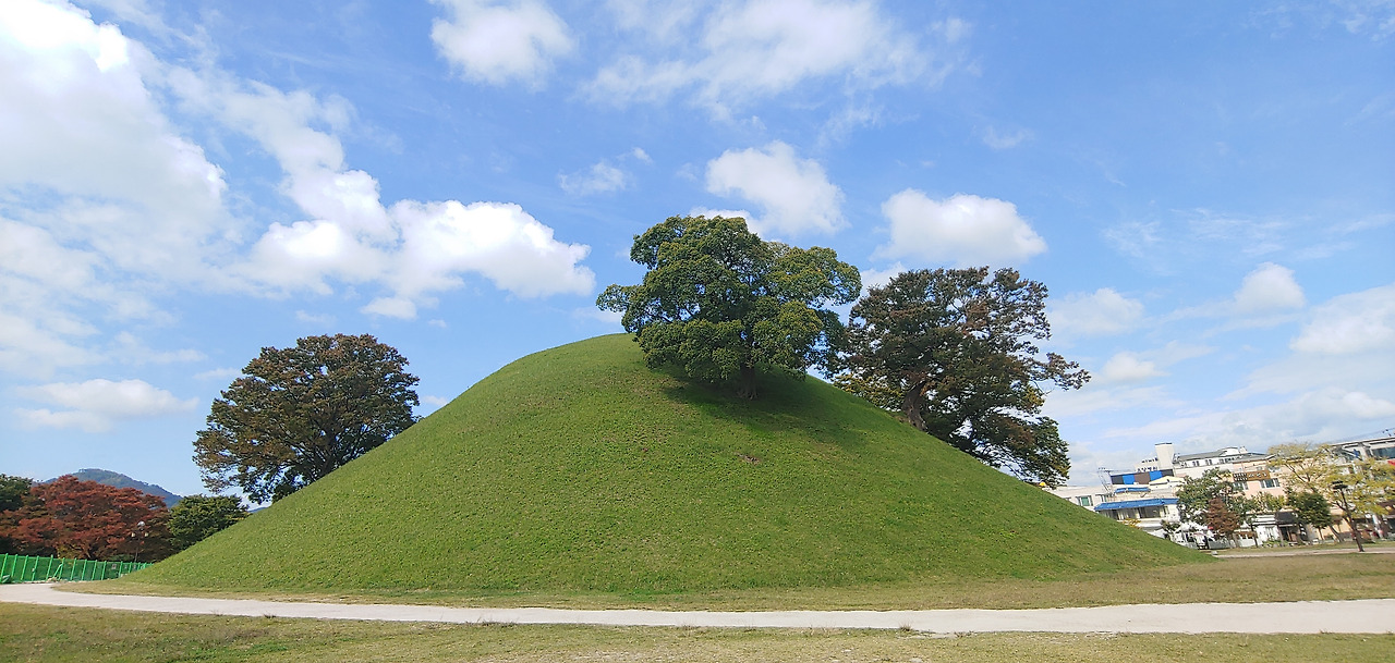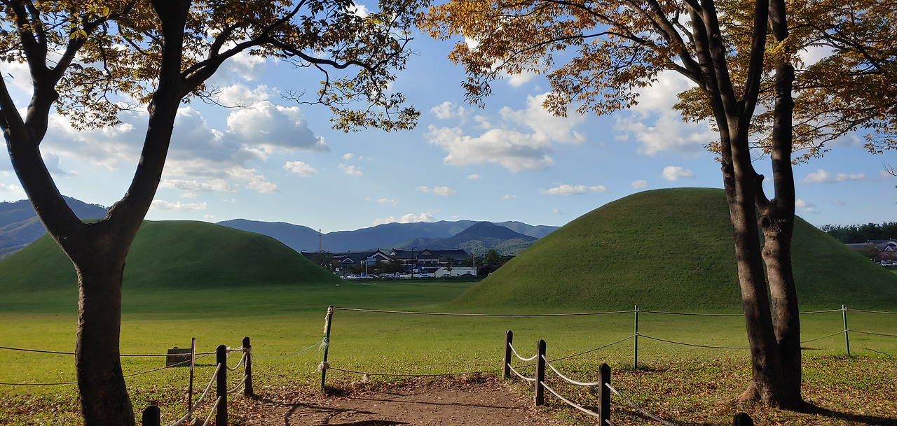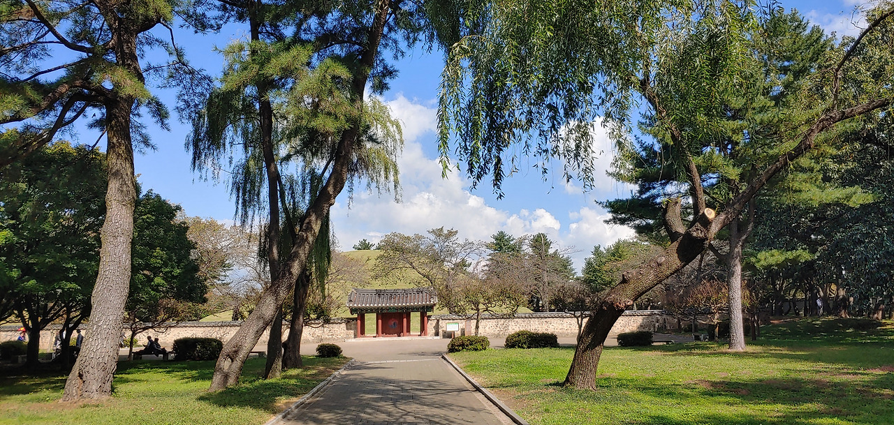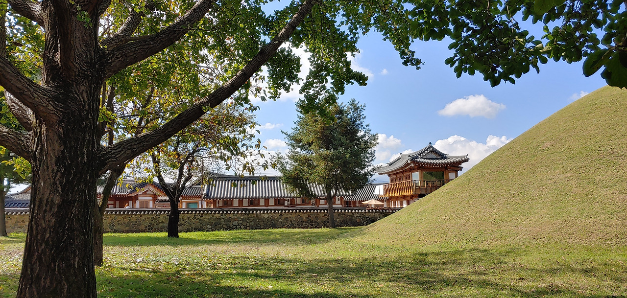 아직 단풍은 없지만 우거진 나무에 그늘이 시원해서 좋았다. 담 너머로 보이는 인공적 한옥이 조선시대 양반이 된 기분도 나게 한다. 신라와 조선시대 기분을 느끼게 하는 대릉원 너무 좋구나. 하늘과 햇살이 주는 asmr을 느끼기 중.