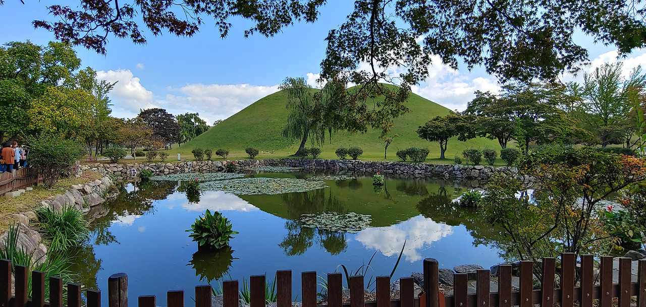 대릉원 안의 정원. 포토존. 물에 비치는 나무와 무덤. 우리 집 정원이었으면 좋겠다.