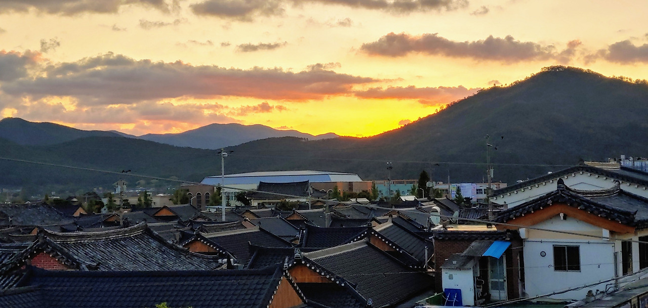 해가 지기 시작하면서 쌀쌀해졌다. 따뜻한 민트 티를 마시며 어두워지는 경주의 한옥동네를 바라보았다. 서쪽 나라 사람에게 딱히 만족스러운 석양은 아니지만 건물이 한옥이라 나름 감성적인 석양이었다.