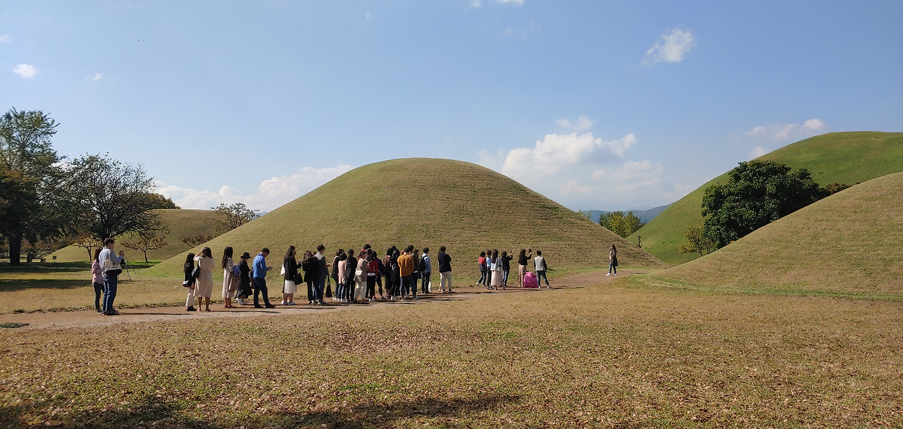 이곳에선 삼각대 깔고 인생 샷 찍는 사람들이 꽤 많았다. 대릉원 안내소 분들이 포토존이라고 광고하시기도 했다. 또 동요되어 따라 셀카를 찍었지만 장소의 분위기와 얼굴의 대비가 심해서 실패.