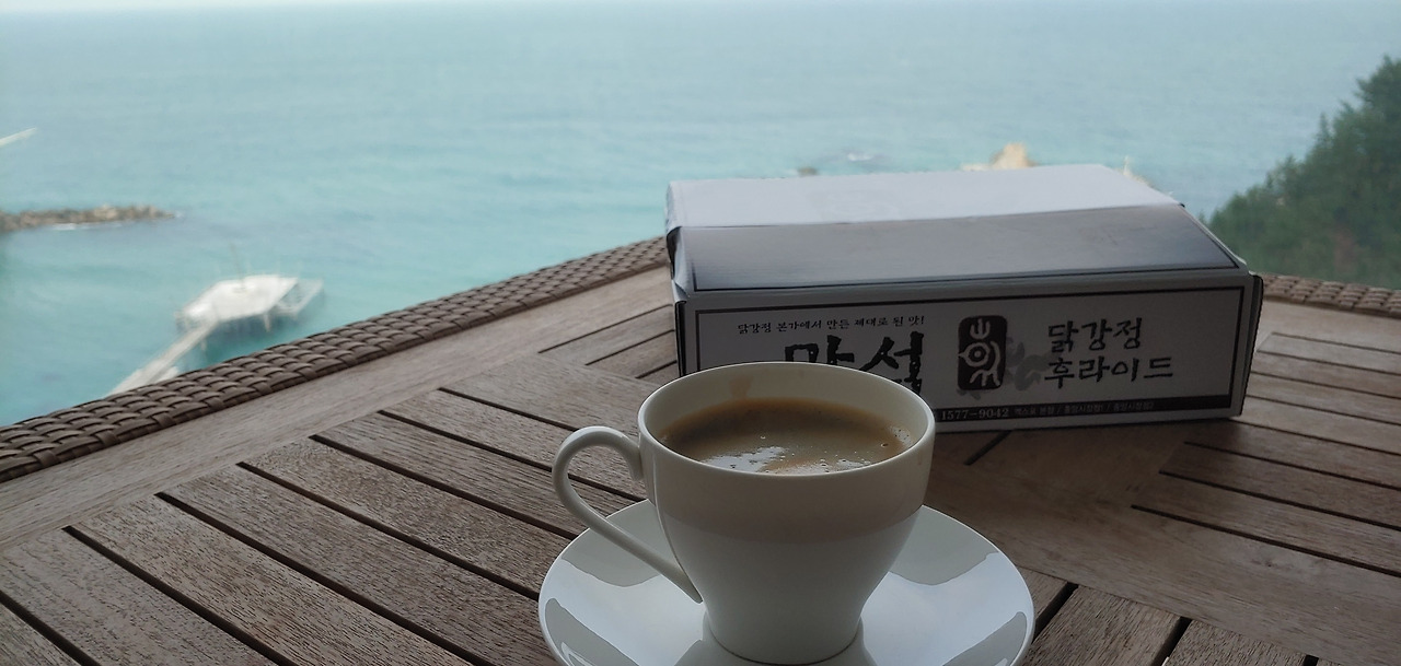 속초에서 사 온 만석 닭강정과 숙소에 비치된 네스카페를 내려먹었다. 닭강정과 블랙커피의 조합이 심상치 않다. 너무 맛있다. 바다 냄새와 바다 풍경이 어우러져 닭강정 폭식을 불러온다.