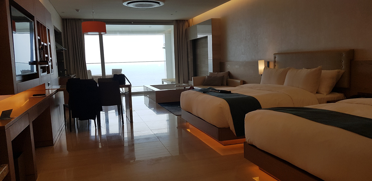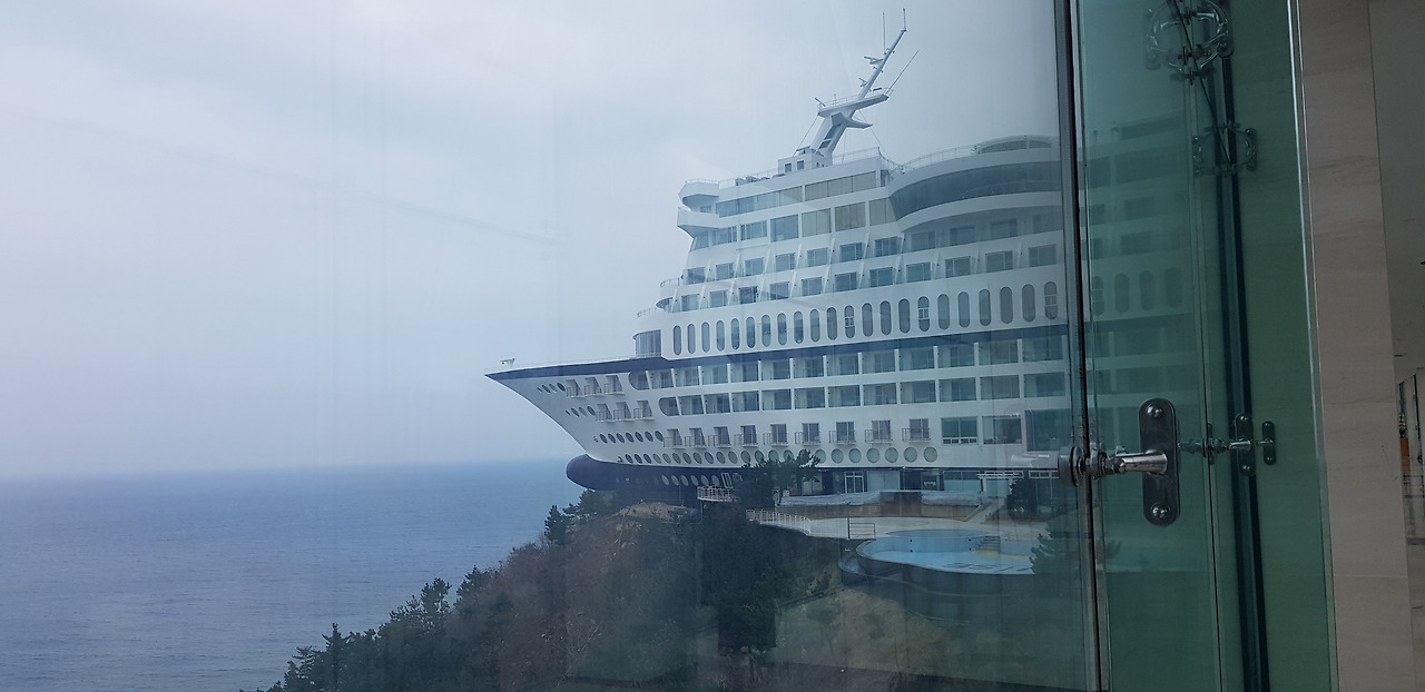 도착한 썬크루즈 신관. 비는 그칠 기세가 아니다. 일몰은 빠르게 포기다. 이곳도 급 방역이 시작되어 마스크를 끼고 명부를 적기 시작했다. 예약 취소가 많다며 방도 업그레이드해주어 원래 예약한 방보다 넓은 곳에 묵게 되었다. 하...