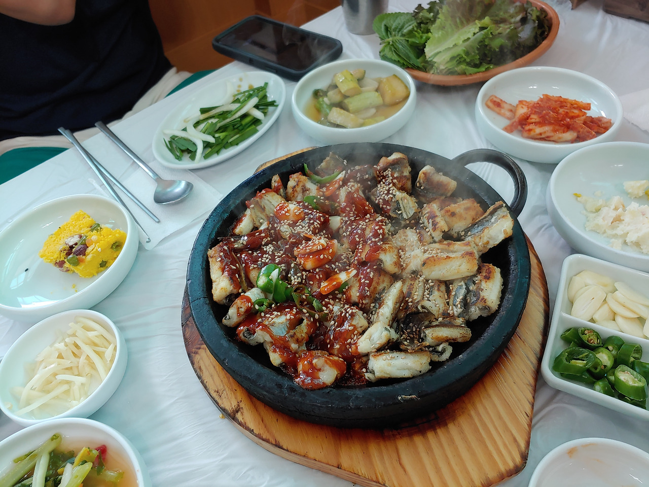 장어를 별로 좋아하진 않지만 달반늘 장어는 꼭 먹는다. 구워줘서 제일 좋다. 양념보다 소금구이가 더 좋다. 집 반찬 같은 밑반찬이 나오고 가끔 고구마나 옥수수도 주신다. 이번엔 떡이 나왔다. 동네 주민들이 밥 먹으러 가는 백반집 느낌이었는데 배용준이 방문한 후로 유명세를 탄 것 같다. 리모델링도 하시고 가게가 깔끔해졌다. 여전히 맛있다!
